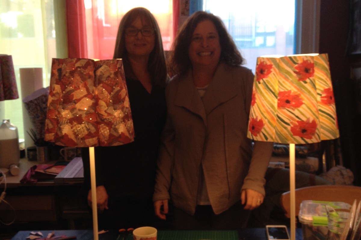 Today’s Papershades workshop with Shari and Christine went brilliantly. They came up with some great design ideas and created two totally unique lampshades. Shari chose to make some cheerful poppies with bold diagonals in tissue paper and Christine went for a collage of specially printed tissue paper in shades of dark pink to go in her daughter’s room, then she pierced the panels to create little dots of light when the lamp is on.