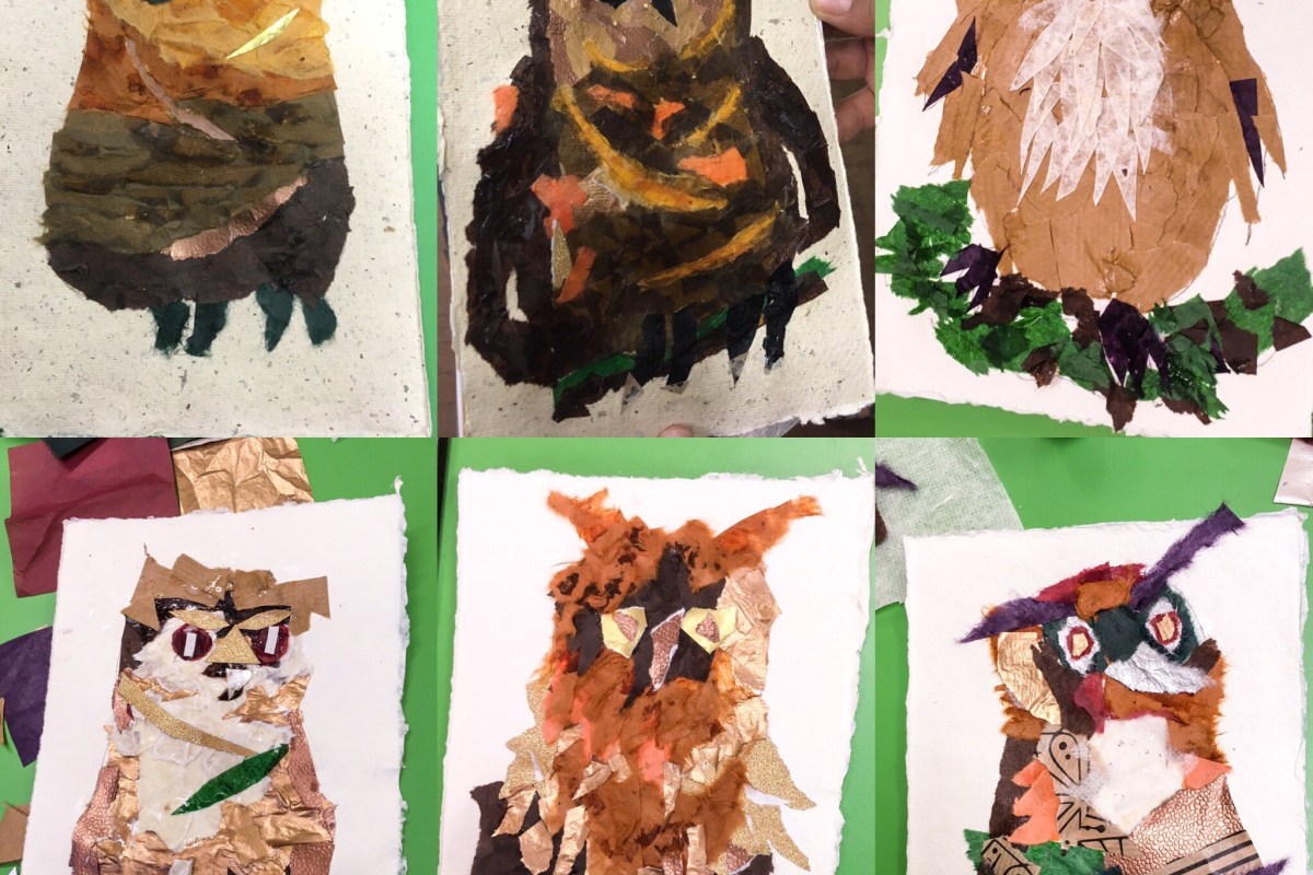 So, what could be nicer than making an artwork of an owl made from paper? When I was invited by the Stroud Green WI to run a collage workshops I wondered what would be the best thing to do. There wasn’t enough time during the Women’s Institute evening to make a Papershade, but everyone wanted to try their hand at snipping or tearing paper to create something.