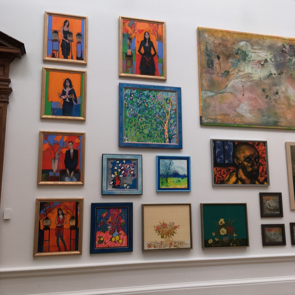 I picked this group, above, because they illustrate the abundance of colour which fills the galleries. I particularly liked the vertical run of acrylic paintings by the late John Wragg RA (on the left).