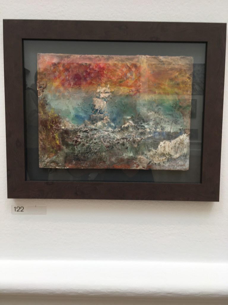 Mixed media – clever and eye-catching. This is by Athena Anastasiou entitled Bringing the Past to New Horizons and made with oil, wood and acrylic yarn.