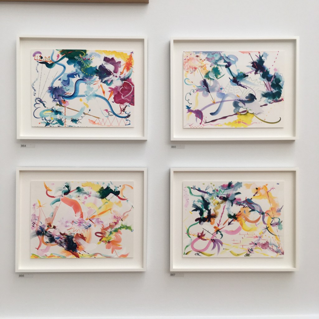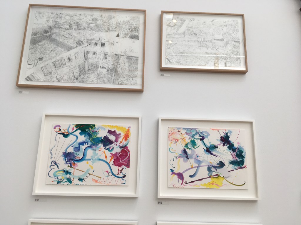 Fional Rae RA presented four Abstract Drawings – gouache and watercolour on paper, which are just lovely to look at, full of movement and joy in the swirl of a brush and colourful mark making.
