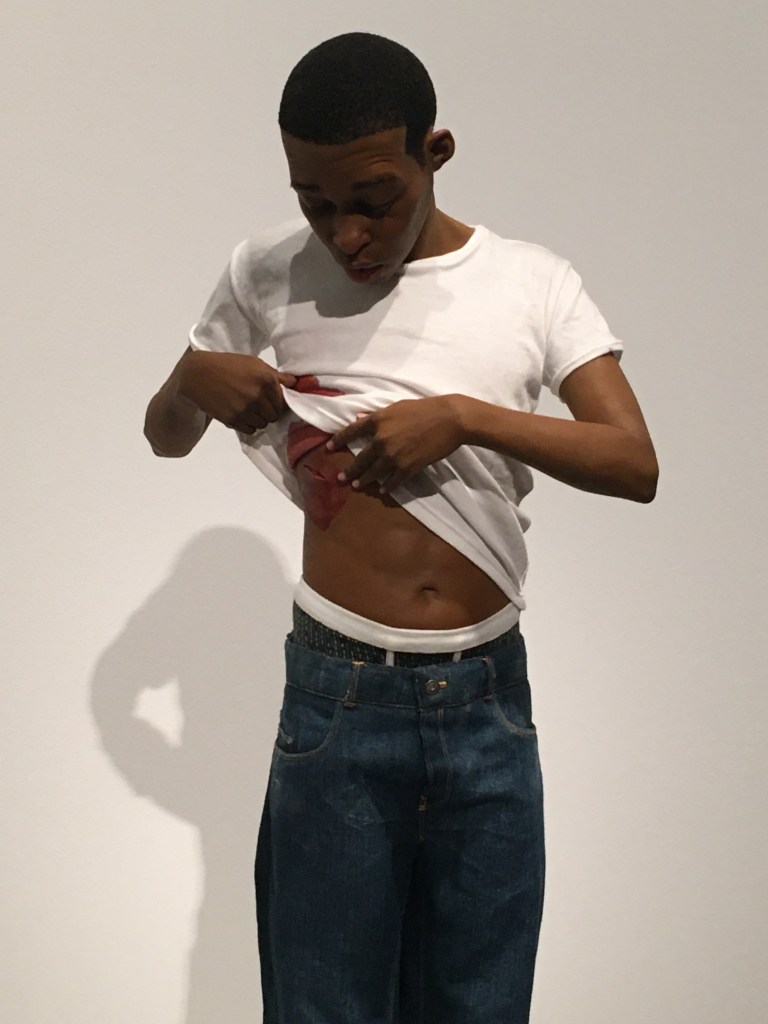 I was intrigued by the small sculpture by Ron Mueck. It’s called Youth and shows a young man examining a bloodied stab wound in his abdomen. Shocking yet strangely calming too. The hyper-realism of the piece is quite mesmerising. Yes, he’s been sinned against – a near death experience – and yet the art is sublime.