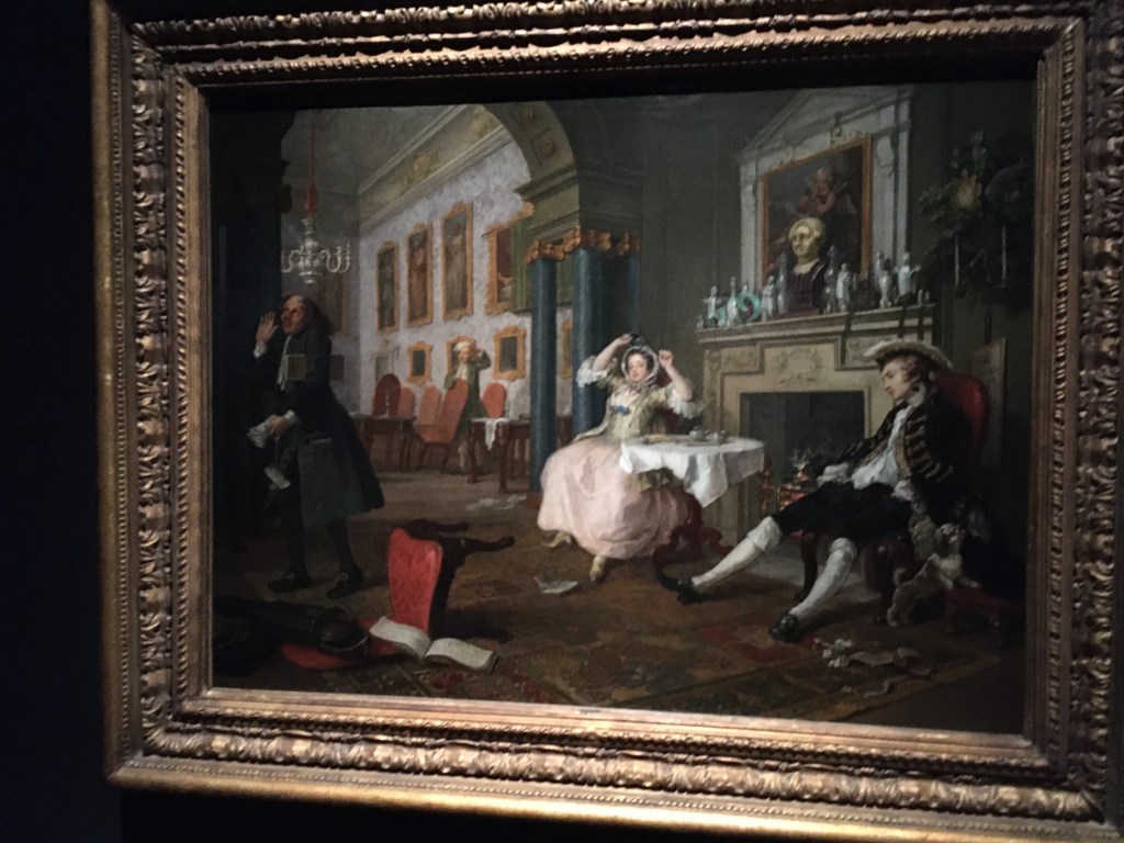 For me it’s always a joy to see Hogarth’s work and here we have the naughty couple at the heart of Marriage a la Mode – both guilty of marital transgression and really not bothered. Hogarth is so brilliant at capturing moments of conversation and drama, not just in the expression of the main players but in the whole set piece. I do like the bust on the mantlepiece which has clearly had his nose broken off and crudely stuck back on.