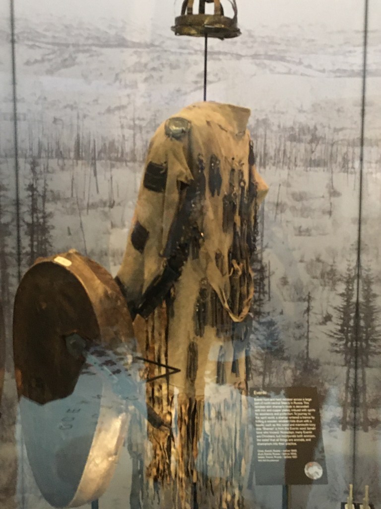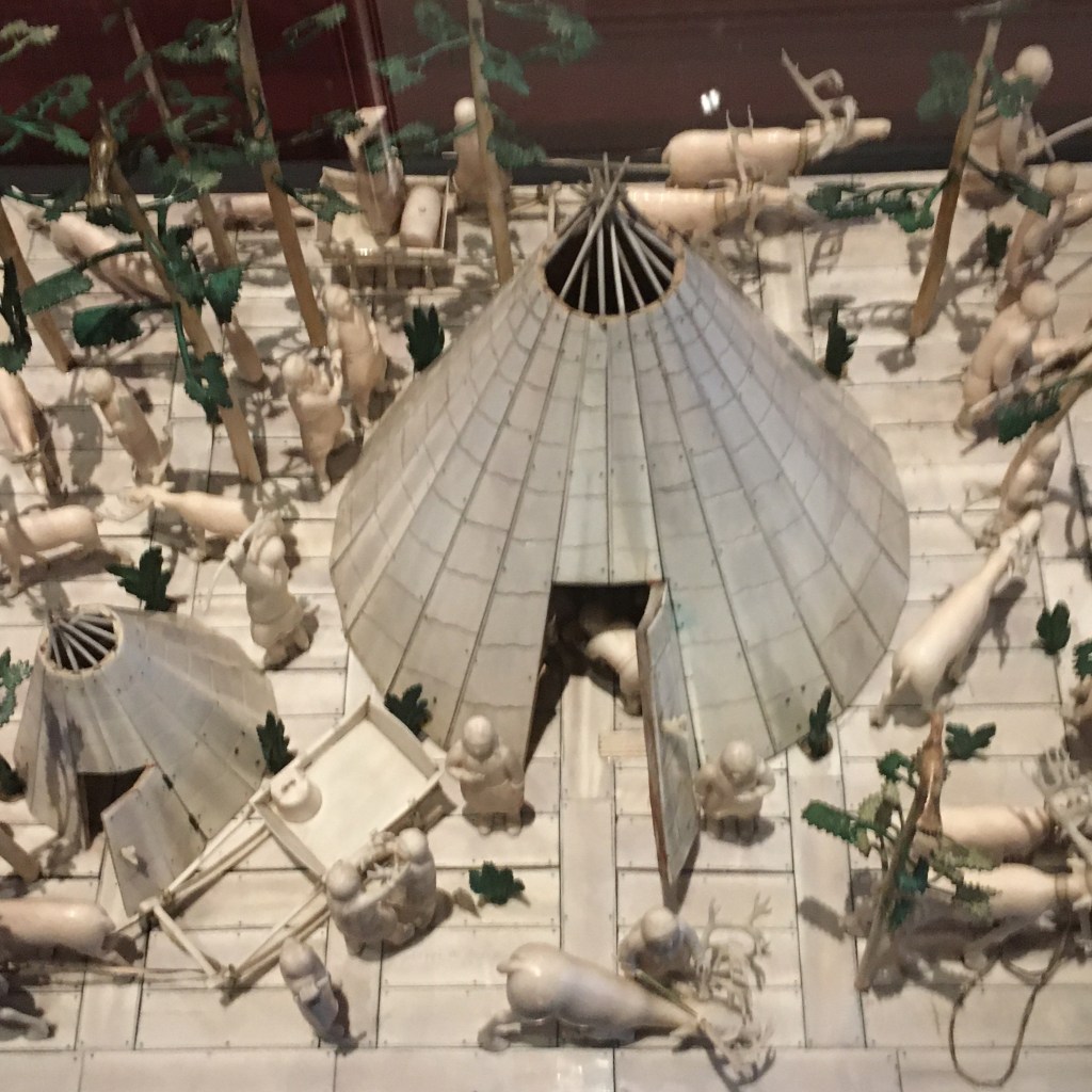 Above is a charming carved display depicting reindeer hoarders of Siberia. It’s carved from mammoth ivory and shows a woman giving birth in the conical tent surrounded by the family, fur traders, dogs and reindeer.