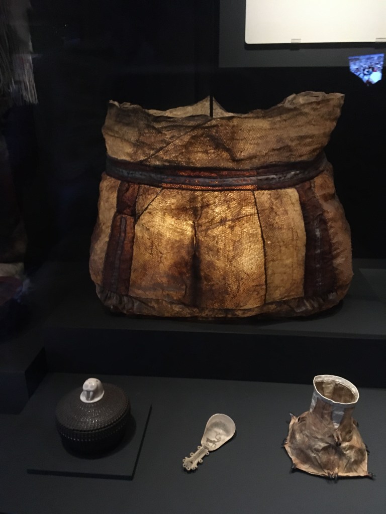 This basket, below, is made from salmon skin – apparently one would be given as a gift to a newly married young Yupit woman. They are waterproof and generally used for storing clothes. The skills for fishskin use are currently being revived as an art form throughout Alaska.
