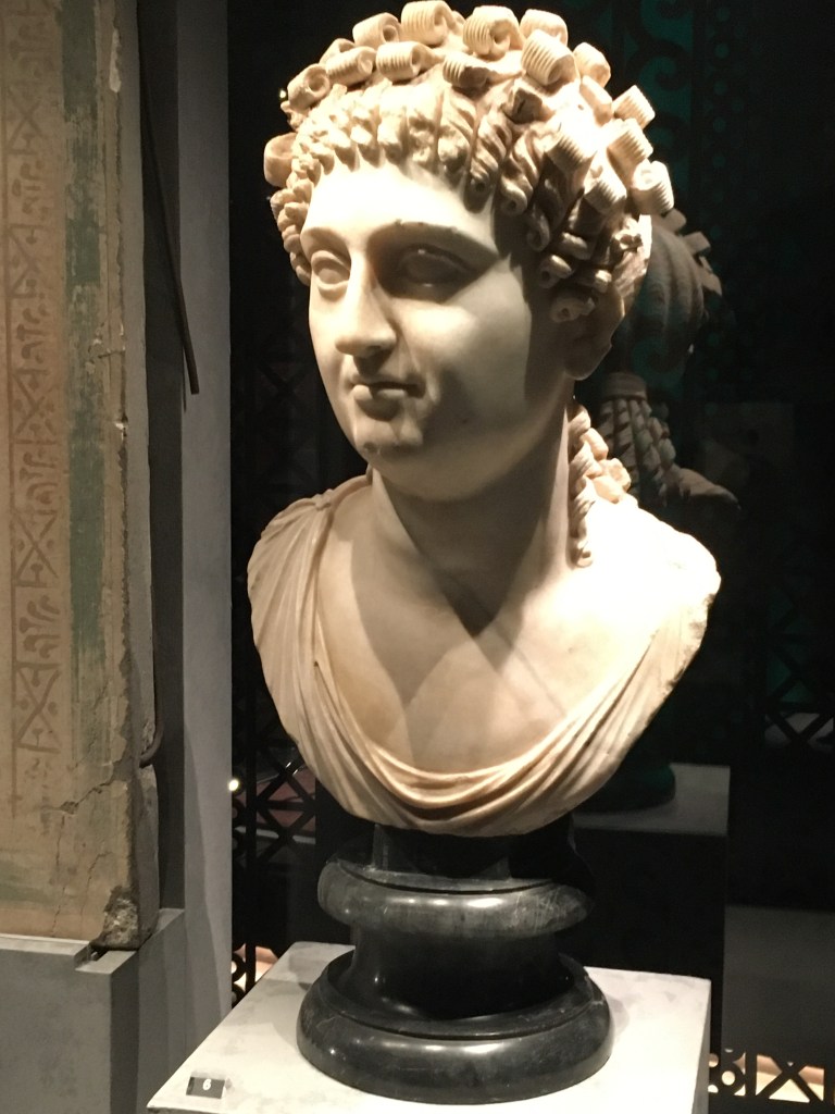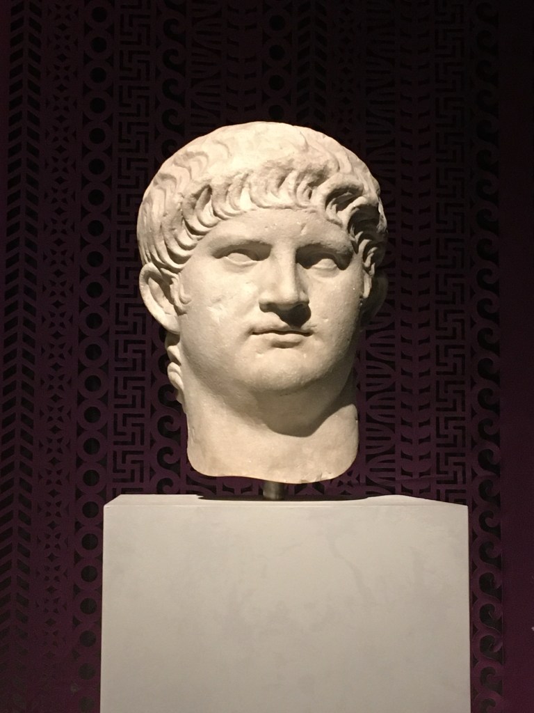 If you’re going to be a hero, a political tyrant or any kind of celebrity it’s a good move to have a distinctive hair do. Nero was no exception. His long fringe with fetching curls around the forehead stayed with him throughout his life and was meticulously depicted by sculptors during his 30 years. Born into the first Dynasty – a powerful family – the son of ambitious mother Agrippina, he became Emperor of Rome and its huge empire in AD54 when he was just 16. This is what we see in this early bust of Nero – a healthy, strong, ambitious young man taking the reins of power in both hands and making his mark.