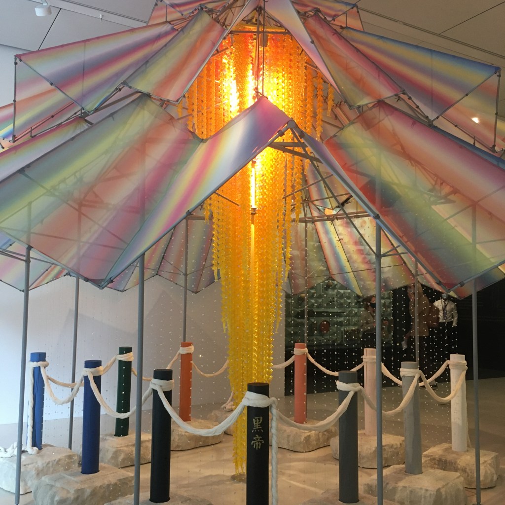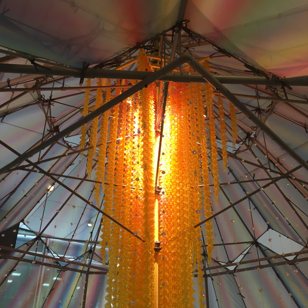 The site of the hastily built temple at Sach’onwang-sa was replaced by a more permanent one but only a few stone foundations of this building remain today. Suh’s creation, made like a multi-layered geometric parasol festooned with colourful silks imagines the way the temple could have appeared when it was hastily constructed. In the centre hang fronds of orange jewels illuminated by an inner light.