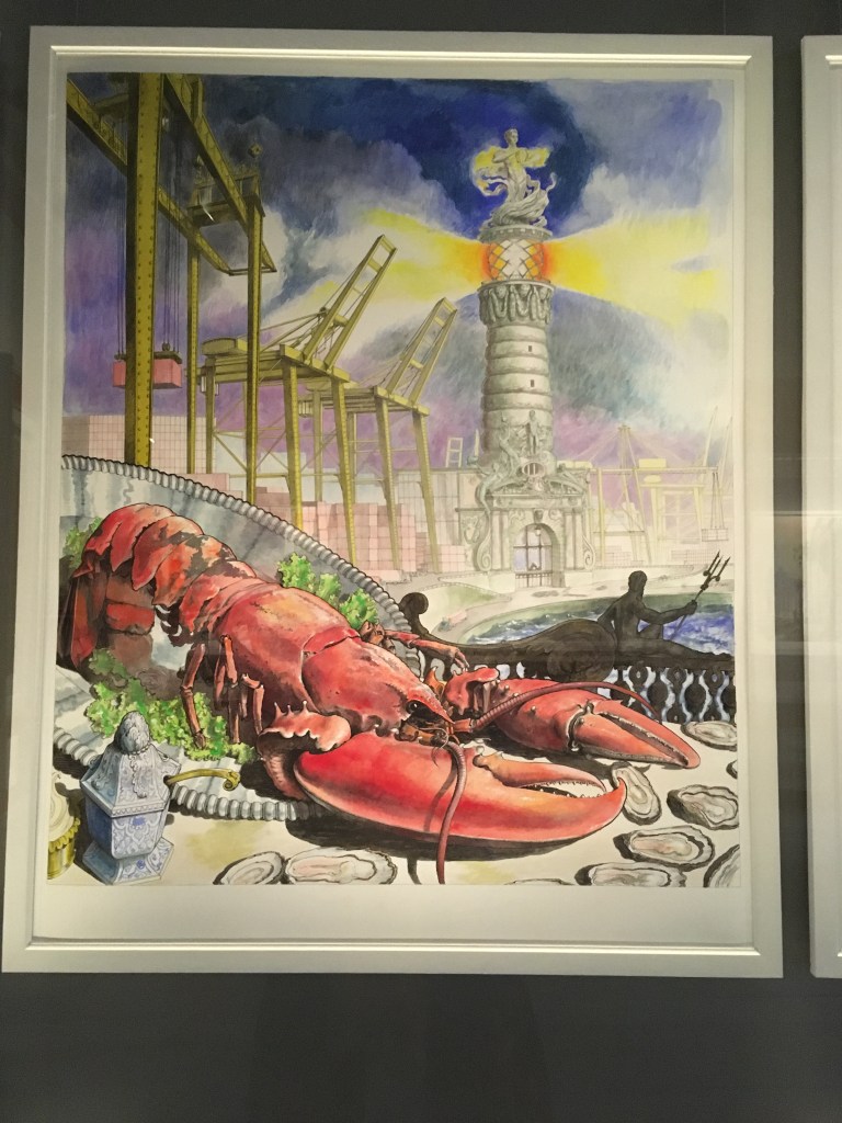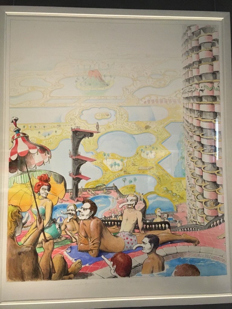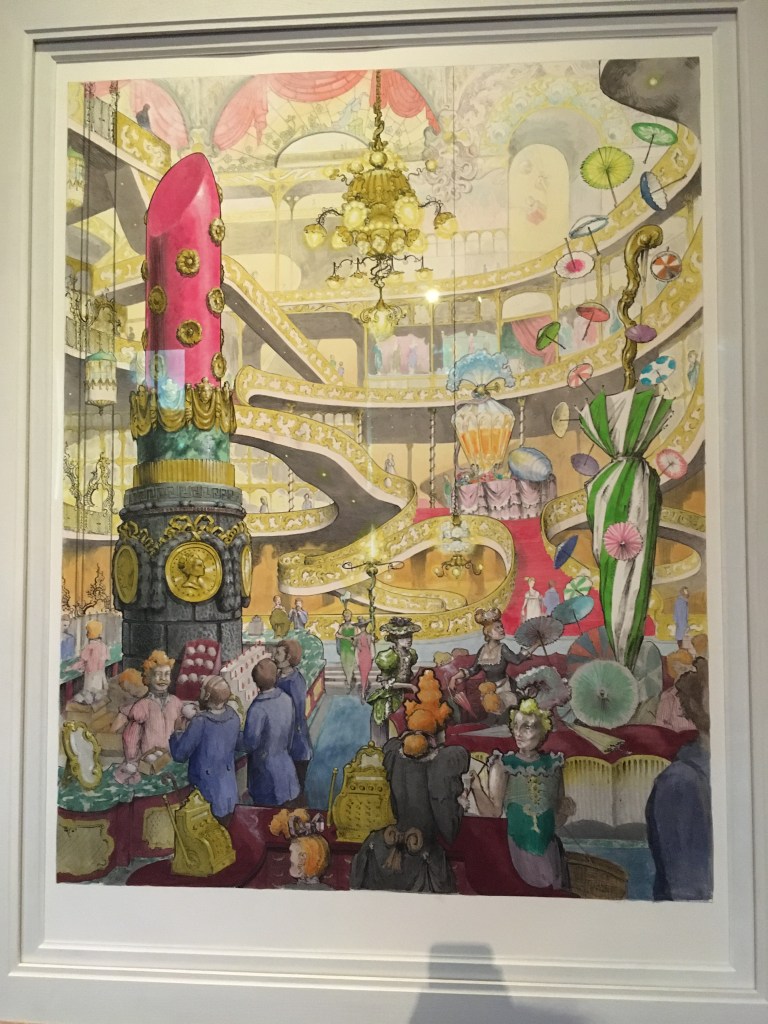 Pablo Bronstein is a contemporary artist who has created his version of HELL with a cycle of 22 large-scale watercolours which are displayed on the first floor of the museum. There is an eclectic range of elements within each picture – 18th century interior design and decoration, early advertising posters, fancy dress, fancy food, playful machines and curious creatures. The familiar is corrupted in surprising and beguiling ways. Buildings loaded with decoration appear to topple, machinery is covered with overblown decorative designs and people wear fantastical clothes. These are some of the ‘noisiest’ paintings you could see! There’s a sense of dazzling excess on show and great fun to view. The meticulously drawn and painted theatrical landscapes draw you into a surreal, fantasy world. The experience is definitely enhanced by seeing them within an already picaresque space.