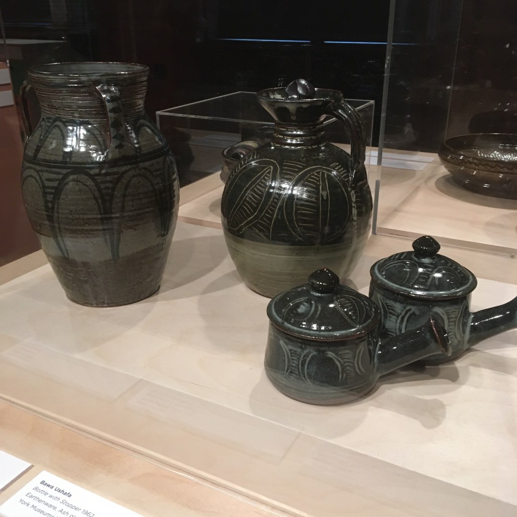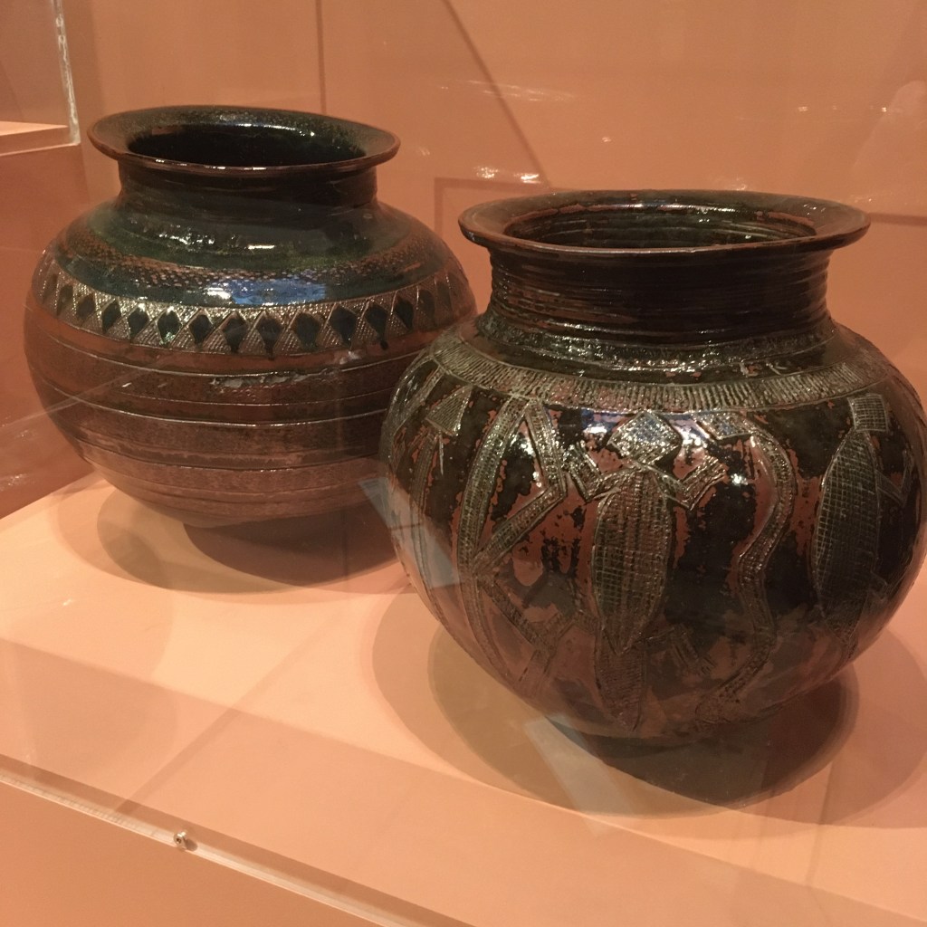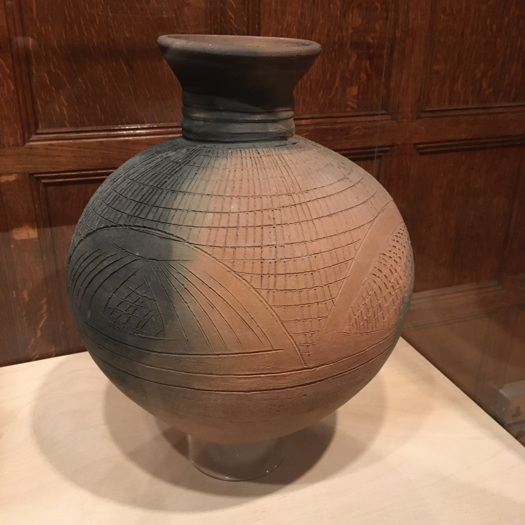 When you think of historical Africa it’s very easy to visualise beautiful rounded clay vessels used for food, water and cooking. What we often overlook is the remarkable artistic hinterland of these pieces. What we also forget is that women made these pots, using clay in its purest state, straight from the ground, using their hands and eye to form practical, durable yet beautifully decorated pots. The exhibition has assembled work by the seminal Nigerian Potter, Ladi Kwali (1925-1984) who was trained in the traditions of pottery and then worked closely with the British potter Michael Cardew to develop a new creativity within pottery. The pot in the picture above was by Dame Magdalene Odundo during her time in Abuja. She learned the skills from Kwali but wanted the world to understand and appreciate the aesthetic of this most ancient of artf-orms. Below is a photo of a pot by Odundo made in 1983.