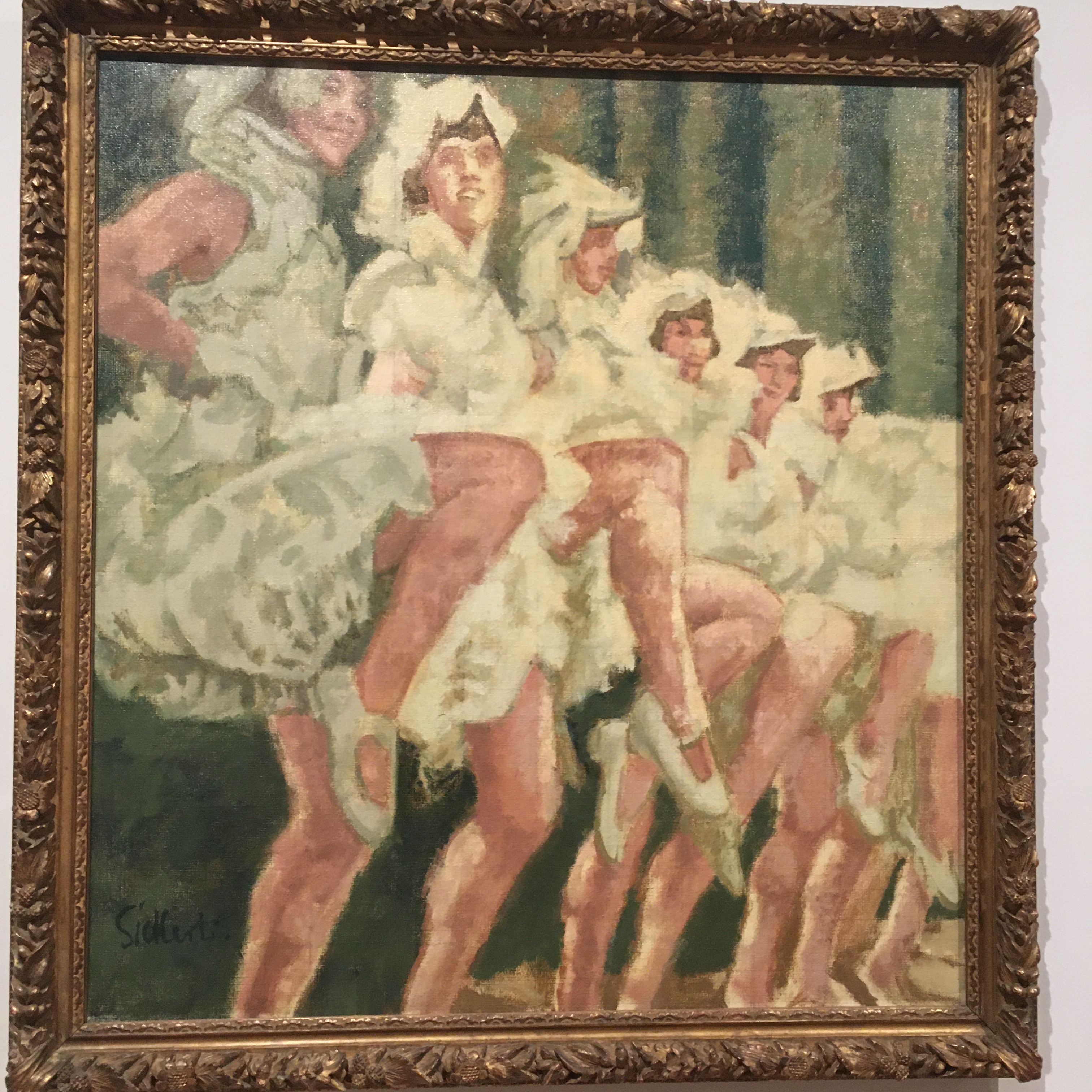 Sickert, born in 1860, started out as an actor. He was clearly drawn to theatre, performers and the audiences who filled music halls and arenas. He follows in a fine tradition of artists such as Hogarth, who loved a bawdy crowd in a theatre, or Degas who loved dancers and musicians and Lautrec who captured unusual angles of performers. These three examples, above, include High Steppers 1938, Theatre de Montmartre 1906 and Bonnet et Claque, Ada Lundberg at the Marylebone Music Hall.
