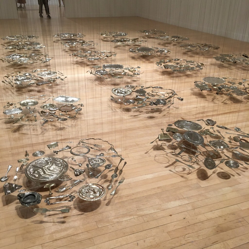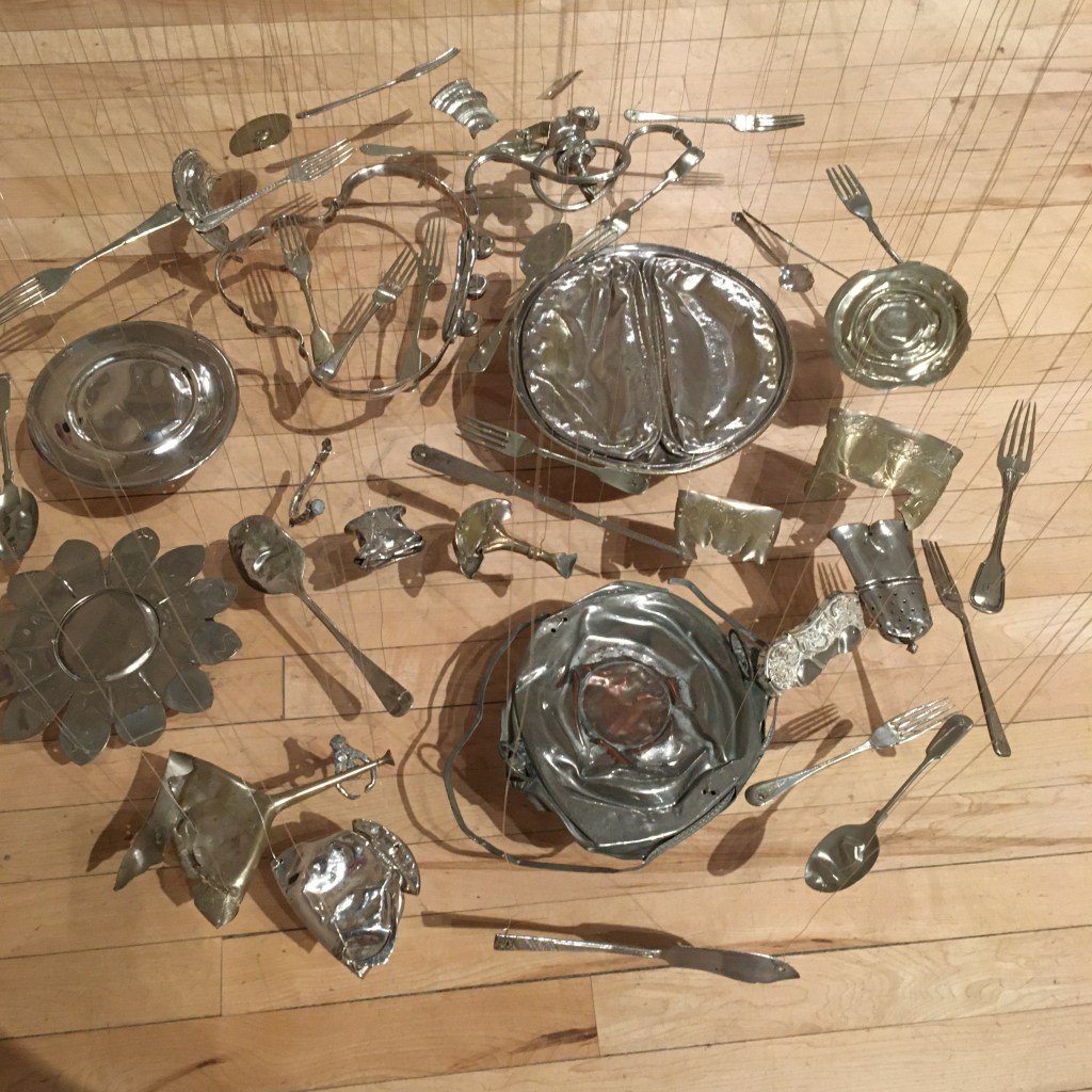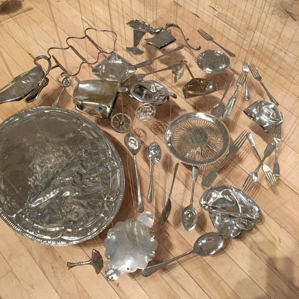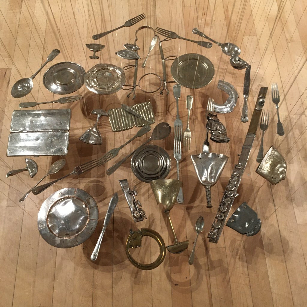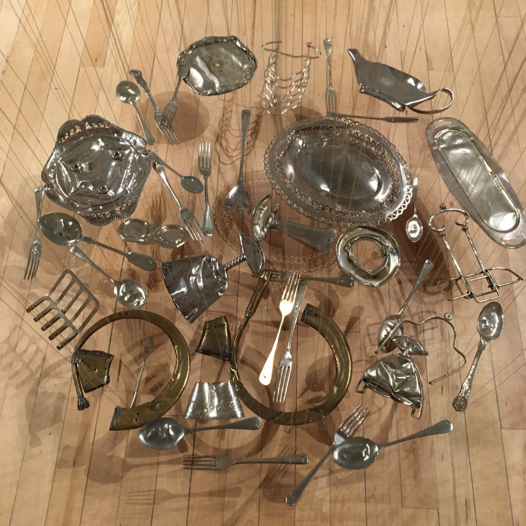 This is a close up of Thirty Pieces of Silver. It fills the space in the most beguiling and attractive way. The flattened pieces of silver plate objects seem to float above the floor in perfect circles. The squashed form seems to enhance the memory of the 3D life these pieces once led and they all have stories to tell.