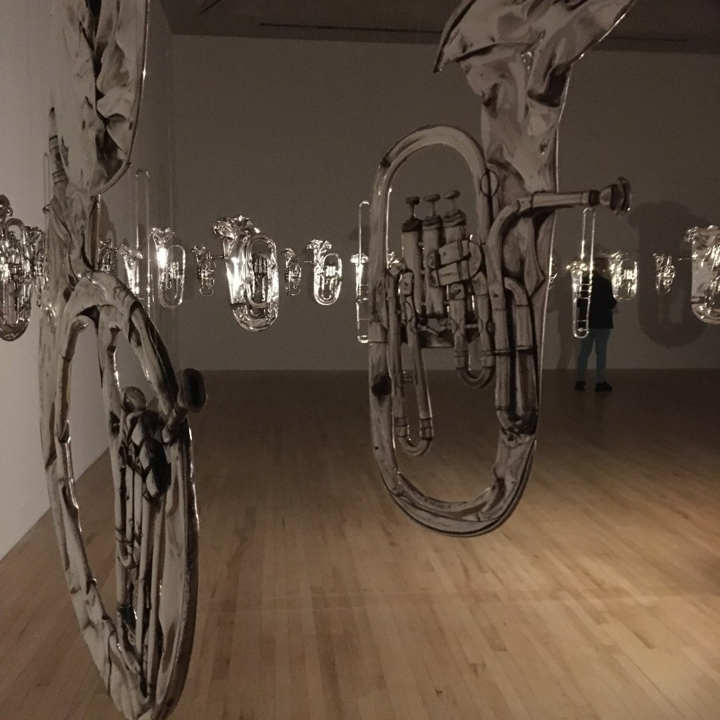 This piece is quite familiar: Perpetual Cannon. I’ve seen it before, at the V&A and also at the Baltic Centre in Newcastle. It was made for a circular installation but looks amazing in every space it is displayed. There’s something both comforting and strange about seeing brass instruments which have had the last breath squeezed out of them beneath the weight of a steam roller. And then you think, yes, that’s a perfect conclusion for these pieces which were designed to absorb human breath and make music. Once no longer functioning, this is the perfect way to recycle and retire old trumpets, tubas and horns.
