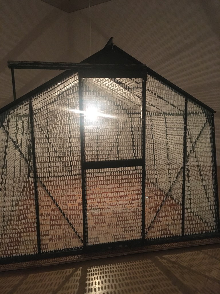 I enjoyed her piece entitled Island. She painted the panes of a greenhouse with white brushstrokes of cliff chalk and lined the floor of the greenhouse with worn encaustic tiles from the Houses of Parliament. The light inside flickers, grows, glows and fades as if the piece is breathing.