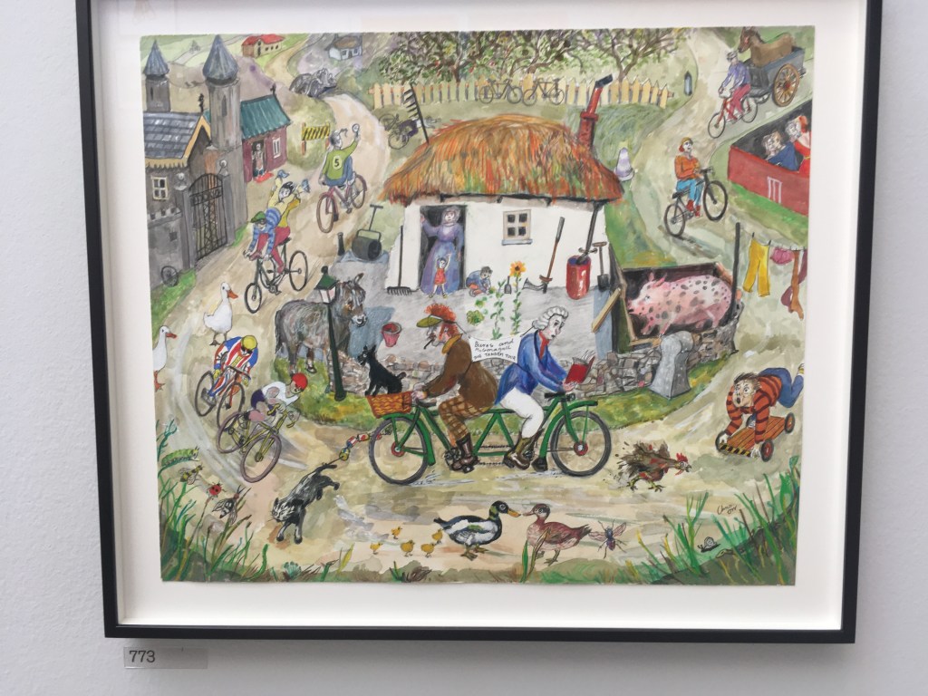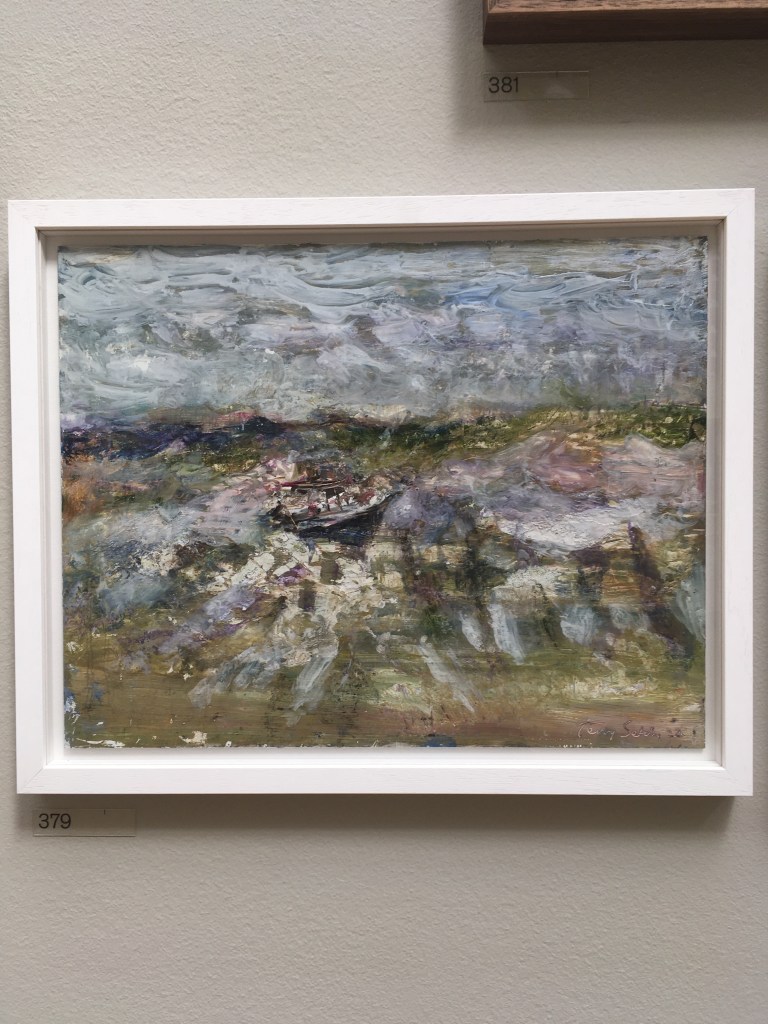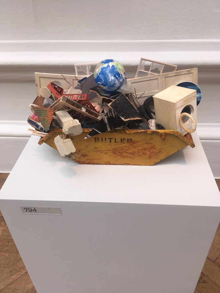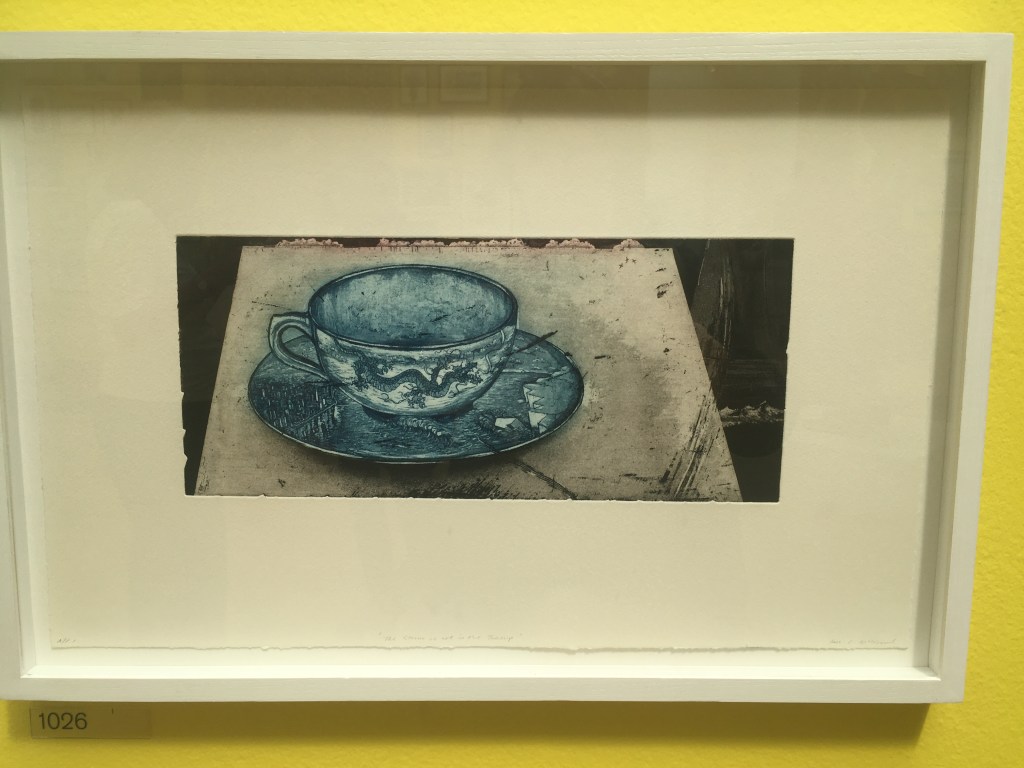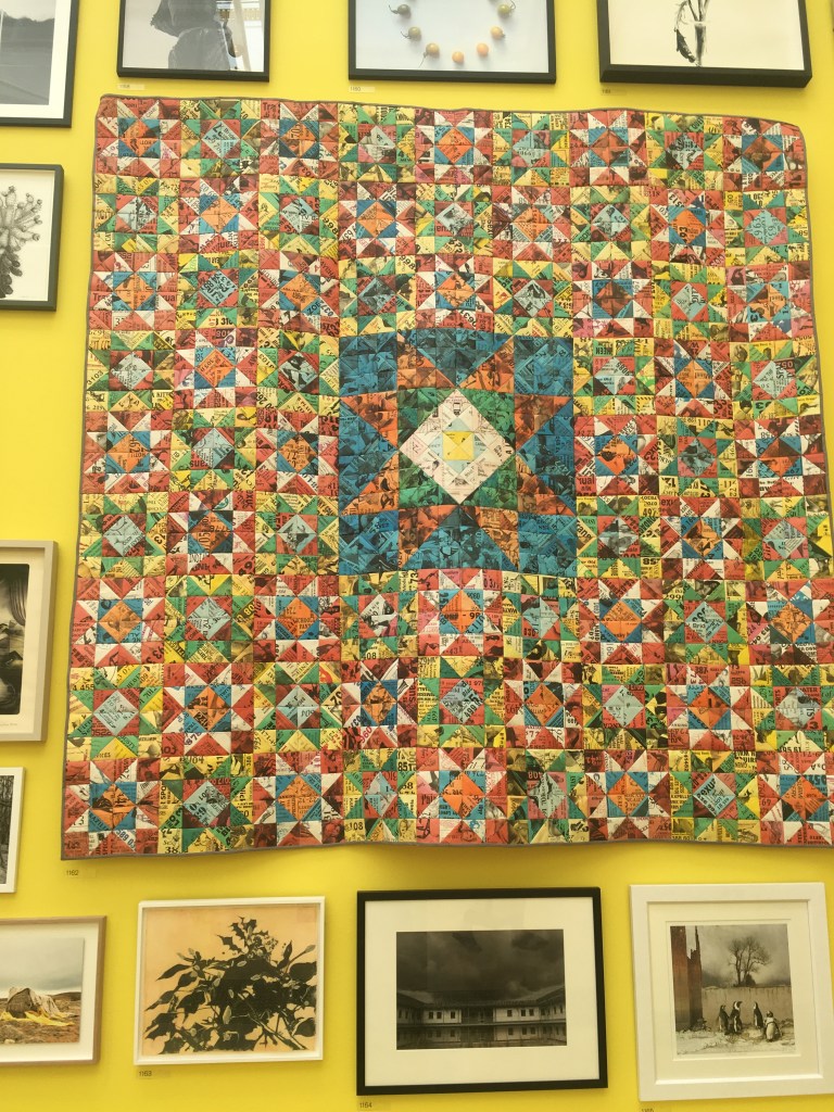 Quilt by Tom Phillips RA Hand stitched paper and cotton fabricAttention All Shipping by Tobias Till lino cut and stencilOne Blood by Dick JewellMoon above St John Street by Timothy Hyman RABurns and McGonagall – the Tandem Tour, by Chris Orr, RA watercolour and oil pastel Bad Lemon by Kathleen Ryan Land skip – Blue Planet by Jeremy ButlerI used to Love you by Kevin KnowlesEveryday Gardening by Davina Jackson acrylic ink and gouache on book cover Unsheltered by Emily Lucas monoprint drawingStag Night by Eleanor Clutton-Brock paper and wire Check 5 and Check 7 by Francesca Simon acrylic and pencil Grayson Perry’s Covid BellMoments Home Sweet Home by Chloe Fremantle gouache and collage on paperErasure by Sarah ArsenaultSunloungers by Jessic Rose, linocutWreck on the Ely by Terry Setch RA oil and encaustic wax on aluminiumListen to the Darkness Sleeping at the Water’s Edge by Kate Davis and David Moore Woven music score and text The Storm is not in the Teacup by Ian McNicol etching and aquatintShort Stories II by Jack Milroy Cut and constructed postcardsVillages ceramic by Peter Barber RA ElectYou Who Never Arrived William Kentridge Hon RA coffee-lift ground aquatint etching