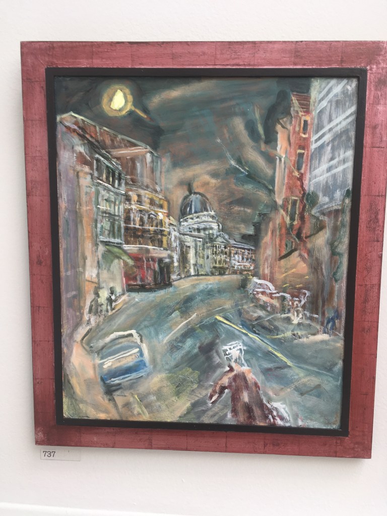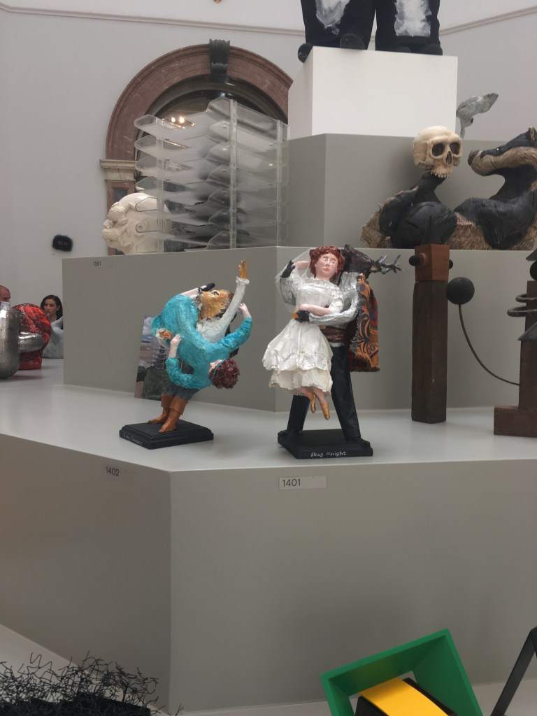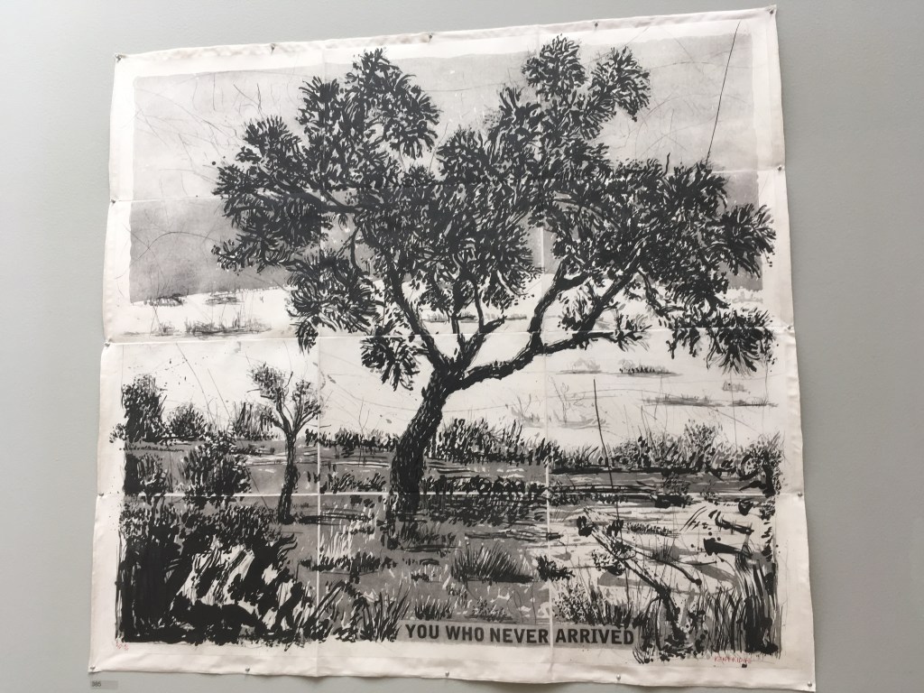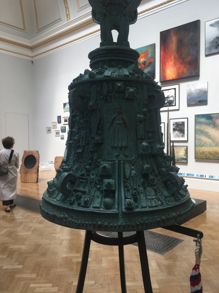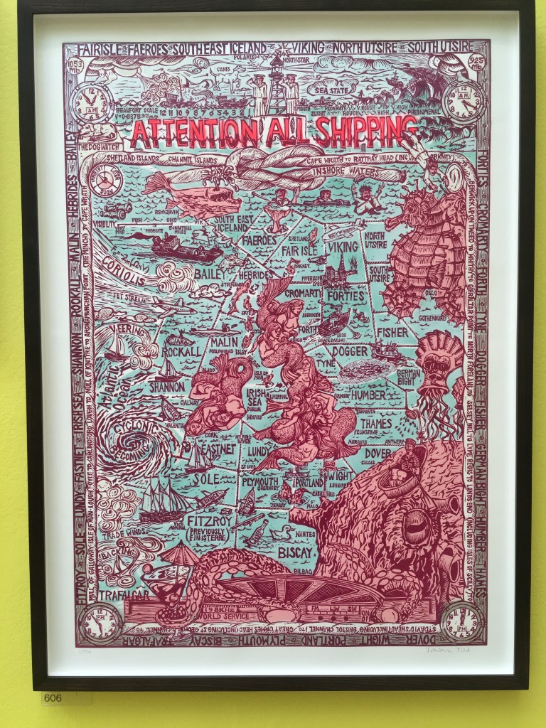 Quilt by Tom Phillips RA Hand stitched paper and cotton fabricAttention All Shipping by Tobias Till lino cut and stencilOne Blood by Dick JewellMoon above St John Street by Timothy Hyman RABurns and McGonagall – the Tandem Tour, by Chris Orr, RA watercolour and oil pastel Bad Lemon by Kathleen Ryan Land skip – Blue Planet by Jeremy ButlerI used to Love you by Kevin KnowlesEveryday Gardening by Davina Jackson acrylic ink and gouache on book cover Unsheltered by Emily Lucas monoprint drawingStag Night by Eleanor Clutton-Brock paper and wire Check 5 and Check 7 by Francesca Simon acrylic and pencil Grayson Perry’s Covid BellMoments Home Sweet Home by Chloe Fremantle gouache and collage on paperErasure by Sarah ArsenaultSunloungers by Jessic Rose, linocutWreck on the Ely by Terry Setch RA oil and encaustic wax on aluminiumListen to the Darkness Sleeping at the Water’s Edge by Kate Davis and David Moore Woven music score and text The Storm is not in the Teacup by Ian McNicol etching and aquatintShort Stories II by Jack Milroy Cut and constructed postcardsVillages ceramic by Peter Barber RA ElectYou Who Never Arrived William Kentridge Hon RA coffee-lift ground aquatint etching