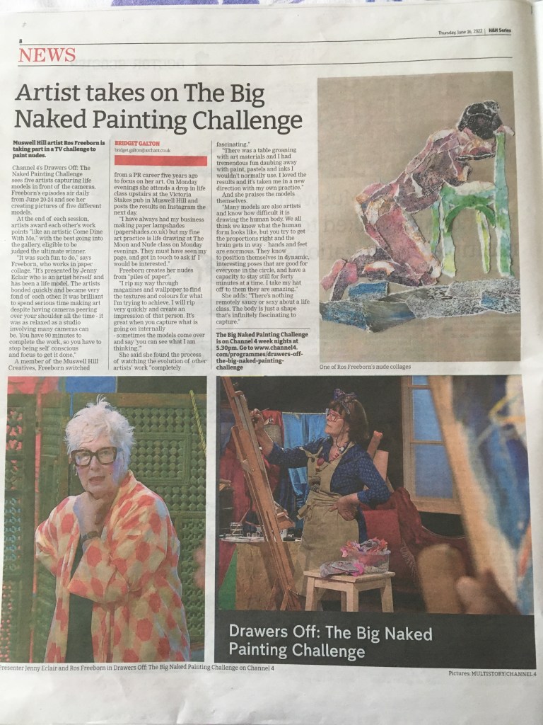 And here are just a few more examples of my paper collage artwork. I attend a life class every Monday run by The Moon and Nude at the Victoria Stakes in Muswell Hill. It helps keep my eye in and the models are always fantastic. Thank you Jenny Eclair and the Drawers Off team at Multistory and Channel 4. And thank you to Bridget Galton at the Ham&High for the terrific piece.