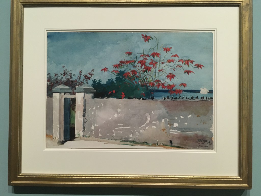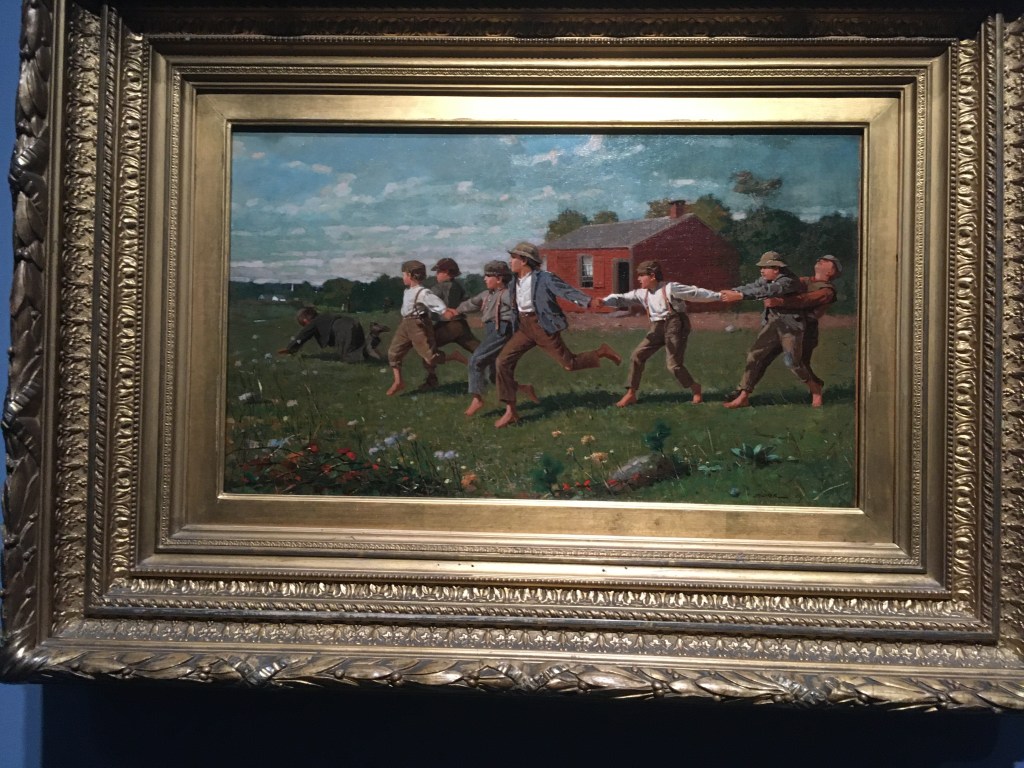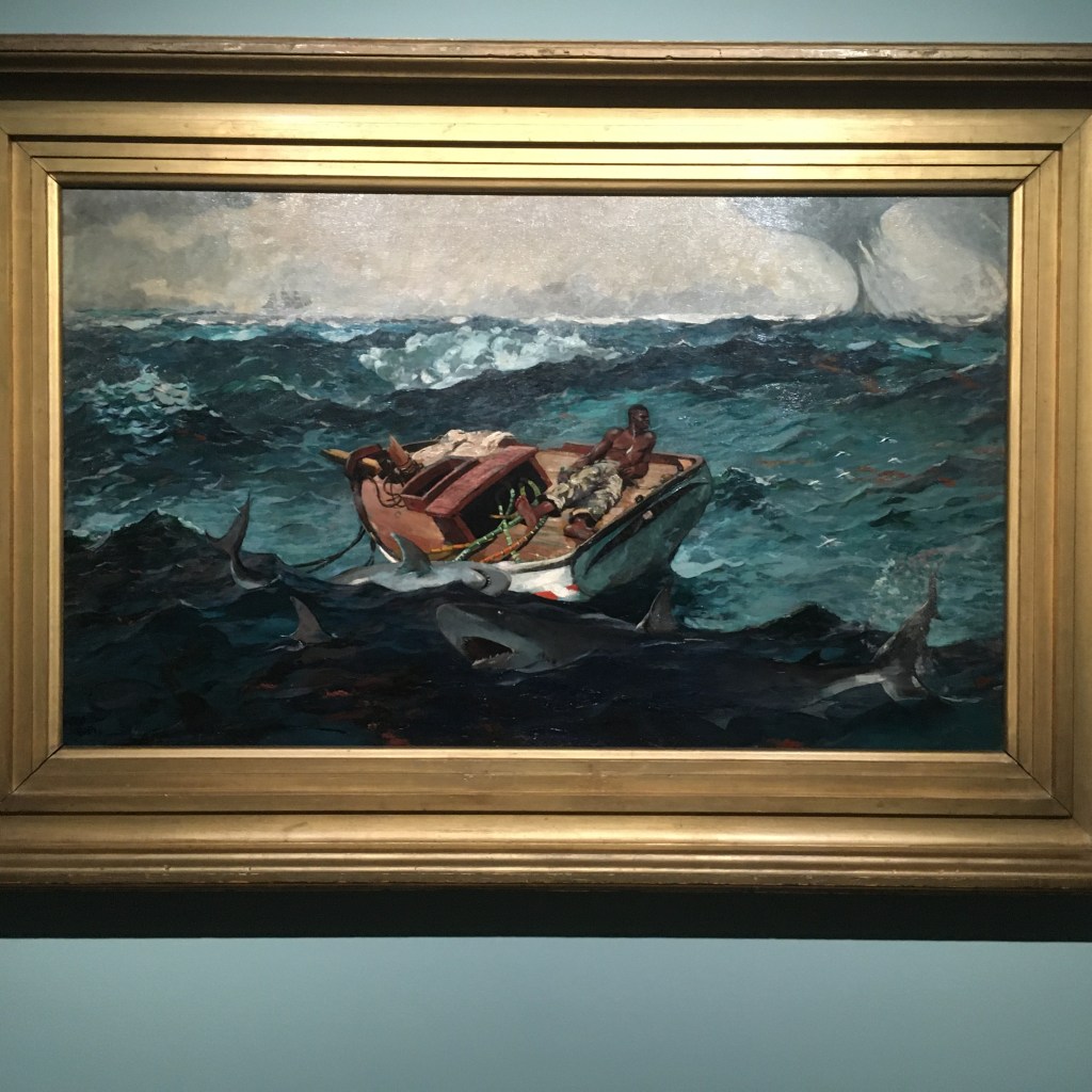 Winslow Homer, Force of Nature. Well, this turned out to be a real treat. I was unfamiliar with the artist Winslow Homer but keen to find out more at the press view at the National Gallery. Homer was an American artist who never had a formal training but began his career as a printmaker and journalist. He was active for newspapers during the American Civil War, getting himself ’embedded’ in both sides of the war recording the conflict between the Union Army – wanting to abolish slavery – and the Confederates who were desperate to preserve the status quo in Southern States. In the early 1860s photography existed but newspapers still needed artists to create plates for the presses to publish. Clearly Homer was a very talented draughtsman who could draw from life, from models and from photographs. He later used his newspaper illustrations as source material for studio-made oil paintings depicting the Civil War and its aftermath and began his career as a fine artist.