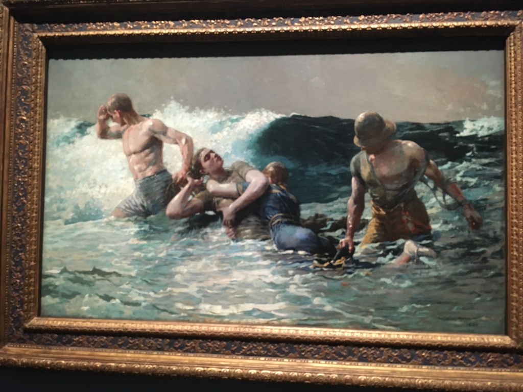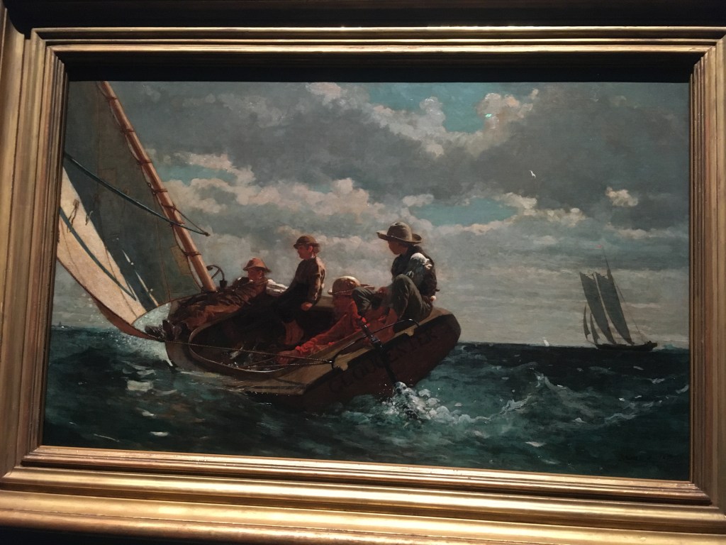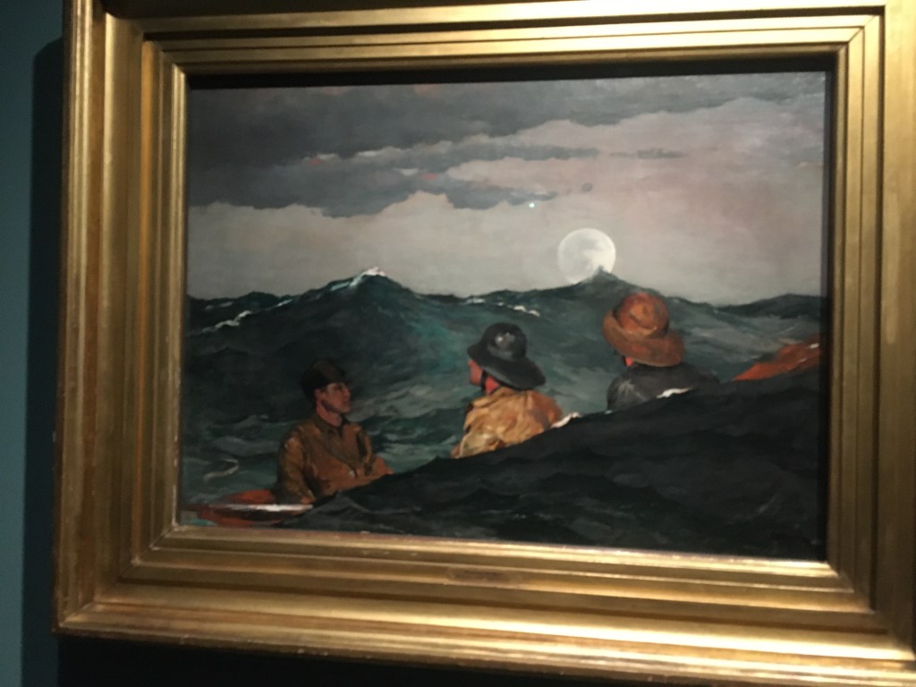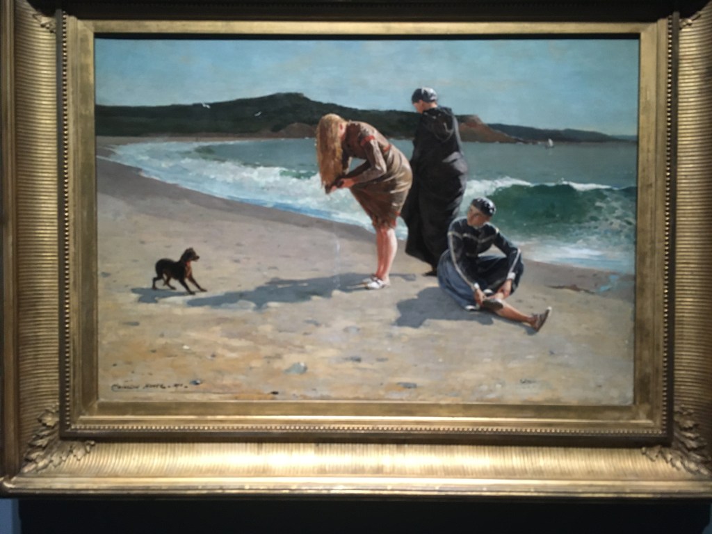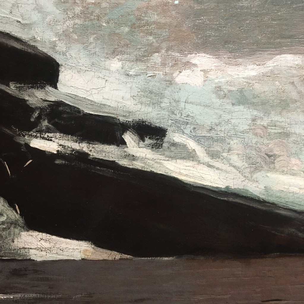 Winslow Homer visited England 1881 and to spend a year and a half at a small fishing village of Cullercoats near Newcastle. The curators suggest there was an artists’ colony established there. This painting depicts a fisherwoman on the seafront, battered by gales and the lash of the sea but stalwart against the elements.