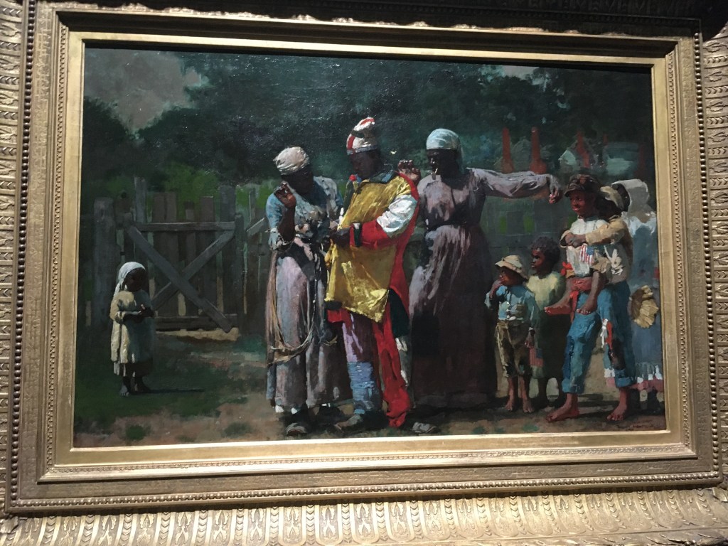 Homer was keen to represent the status of Black Americans following the Civil War and the end of their enslaved status. The painting on the left is called Dressing for the Carnival (1877) when Independence Day celebrations became a commemoration of Black liberation. On the right is A Visit from The Old Mistress. This depicts three freedwoman and a child as they meet an elderly woman – presumably their onetime enslaver who now pays for their labour.