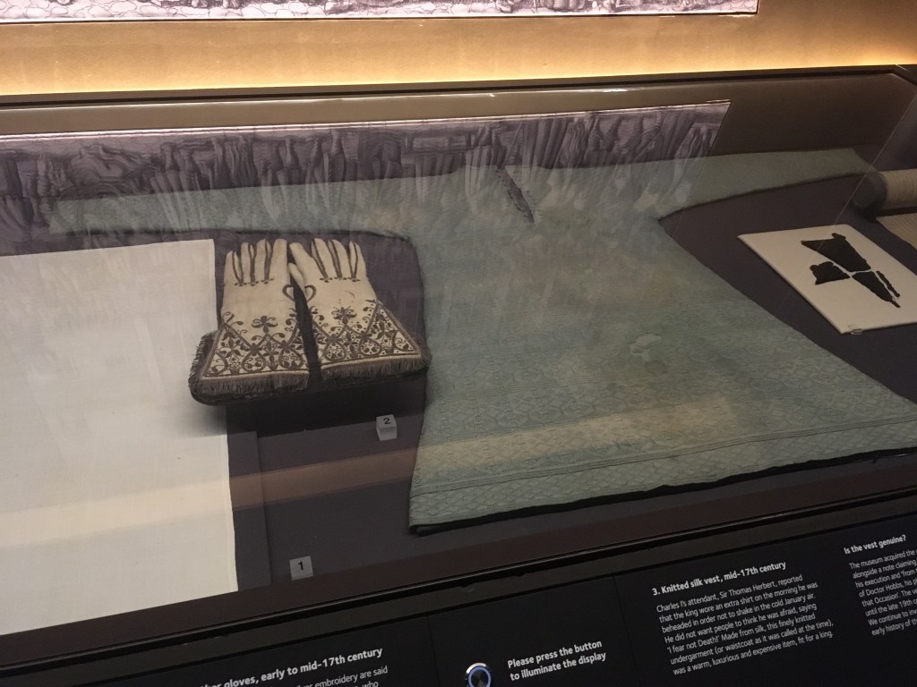 Below is my photo of the blue shift which is said to have been worn by Charles I on the day of his execution. I’ve also added a tiny token painted with his image which was kept by a supporter after his death. Holding onto items like this would have been extremely dangerous, if discovered, and it’s remarkable that these objects have come through careful curating to the Museum.