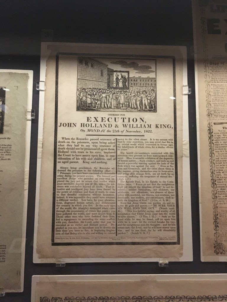The Museum of London has assembled quantities of artefacts relating to executions: beheadings, burnings, hangings and all the other horrible things that man felt it was acceptable to do unto man in the name of punishment. And, for centuries, there were around 200 crimes which attracted the death penalty. Without a police force or strong justice system you could argue that deterrent was the best way of keeping men and women away from crime. But it didn’t work that way and, as we see from some of the sad letters written by prisoners on death row in the 1700s, they might protest their innocence to the end but were sent to the gallows anyway.