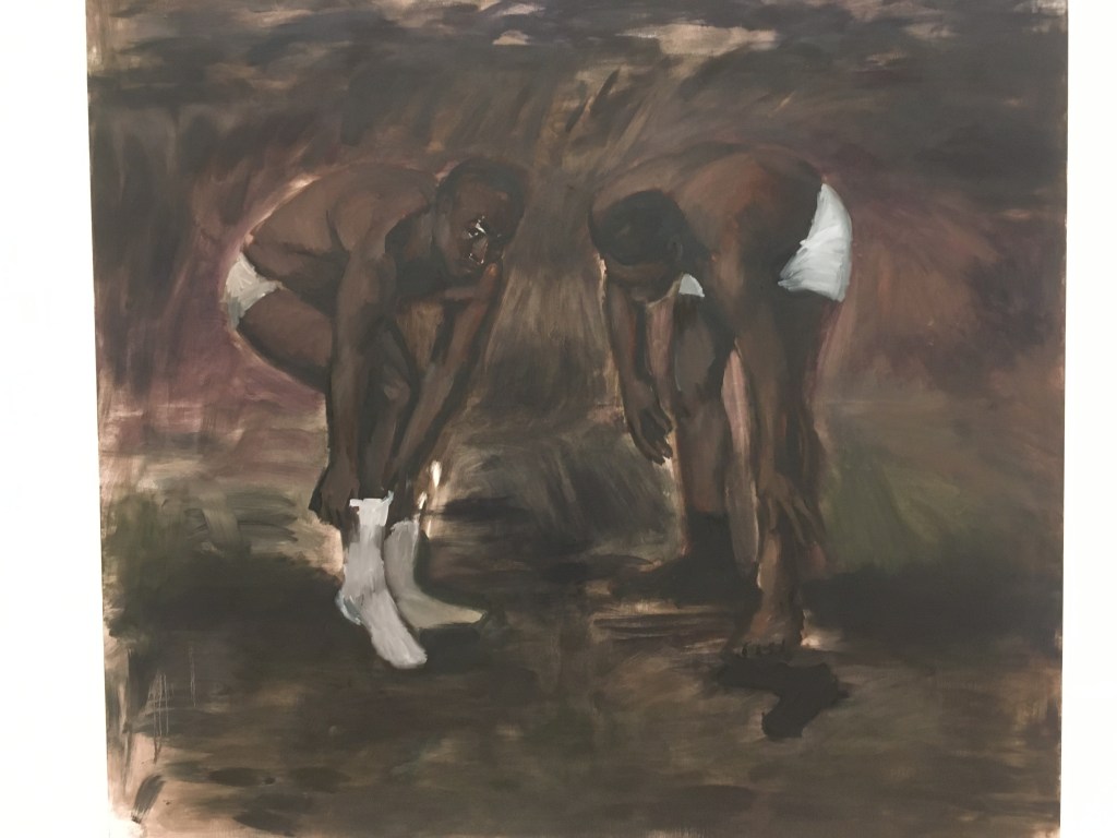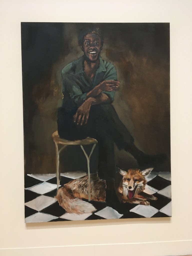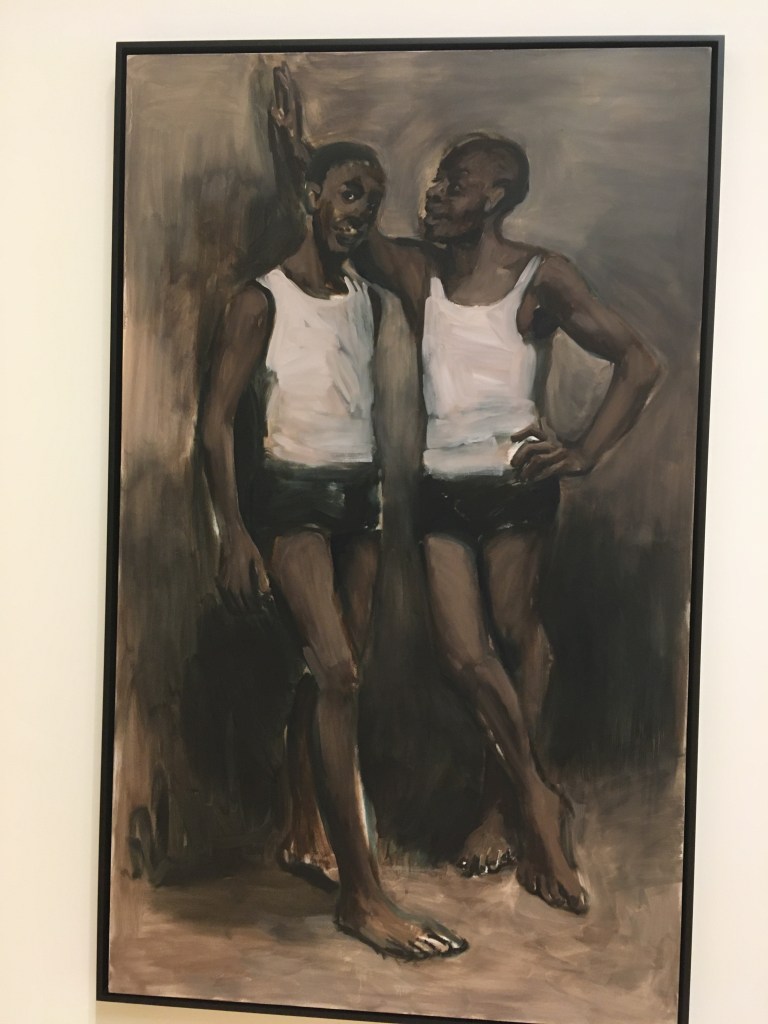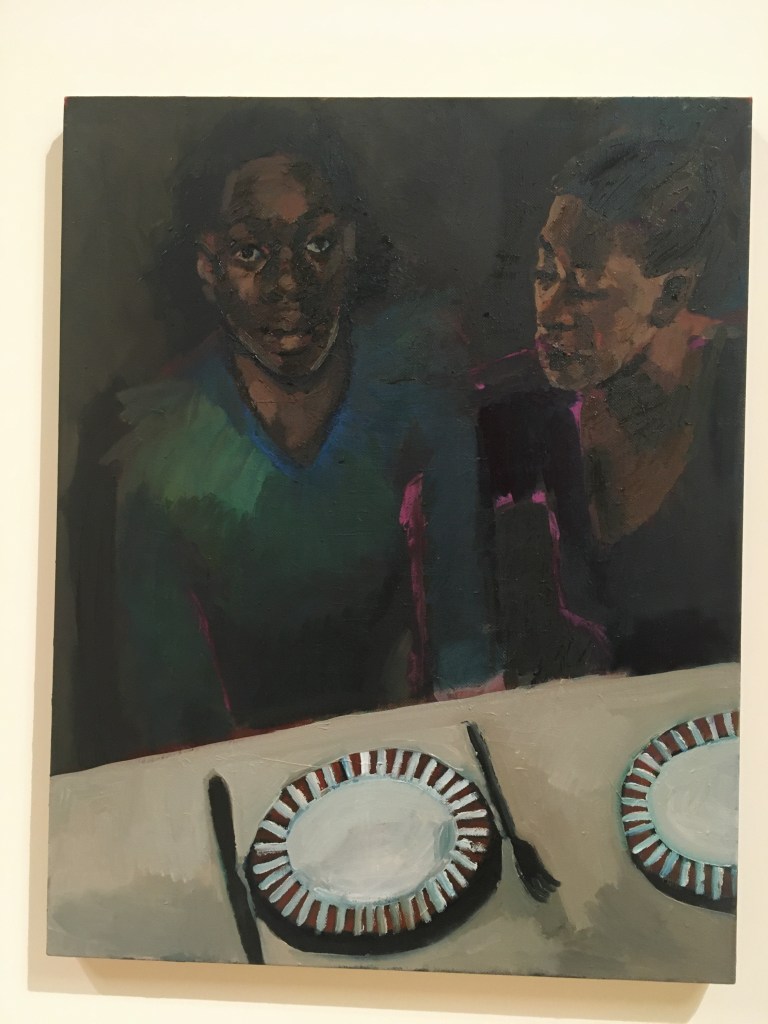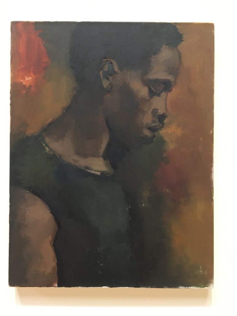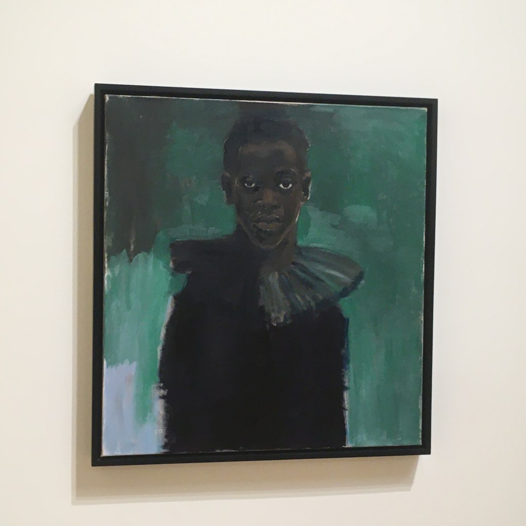 The painting technique interests me too. I look at them and see speed of work. This is, apparently, the case. Yiadom-Boakye does choose to work quickly. I can see that she starts on a white canvas or linen, uses great sweeps of red paint for the underdrawing and swiftly creates the image on top using dark tones but leaves little flecks of white and light to enliven the image. There is nothing laboured or detailed about these works yet you get just enough information. The gaze, the sense of engagement is very strong.