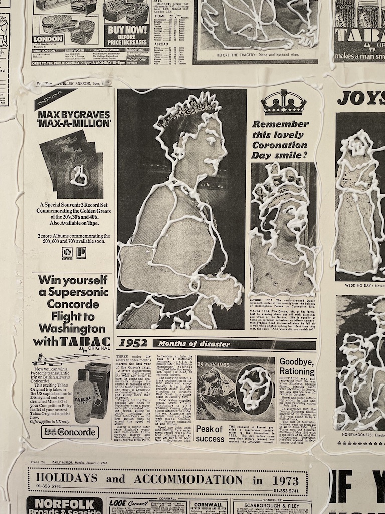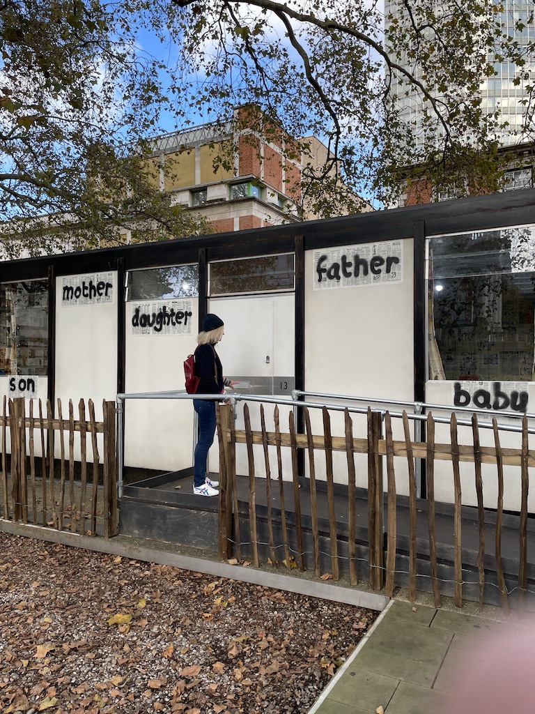 Outside Tate Britain, on the grass to the right of the gallery steps, is a really fascinating installation which is part of the show. It’s an ‘edible artwork’ by Bobby Baker. It’s the re-staging of an artwork entitled An Edible Family in a Mobile Home which was first presented in 1976. You enter a pre-fabricated East London house which has been entirely papered with newspaper and magazine pages. The images have been outlined in icing. The figures within the house are all made of cake and biscuits – a man slumped in a chair, a boy in a bath, a figure on a bed and a baby in a cot. The woman is portrayed by a mannequin with shelves in her abdomen where food is stored. This is a replica of the original work with some updates added by Bobby Baker. But all the food sculptures are edible and, as the exhibition lasts, the cakes and biscuits will be eaten. It’s a very intriguing installation. However, my feet stuck to the floor and on rainy days visitors might find the visit a very, very sticky experience, but it’s huge fun and thought provoking too. I do recommend you pop in if you’re passing Tate Modern.