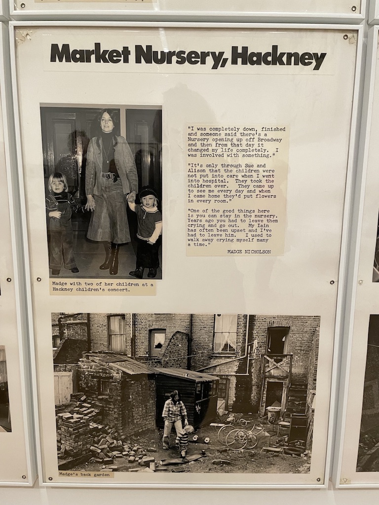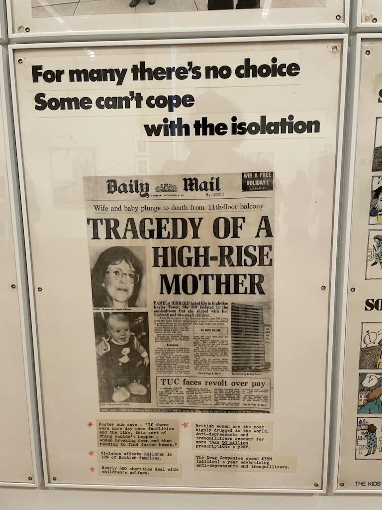 I was very struck by the newspaper cuttings charting the experience of women living in ‘modern’ high rise dwellings in Hackney in the 1980s. I would guess that the architects of these homes were not women. With no space for children to run about and the challenges of dragging everything up and down many flights of stairs when the lift doesn’t work it’s understandable some women reached the end of their tether. But a group of women did find a solution. They took over an old building (at ground level) with outdoor space and set up a nursery. Once a safe place for childcare is established then women can work. It seems so blindingly obvious that you do wonder why designers and planners never thought about such things.