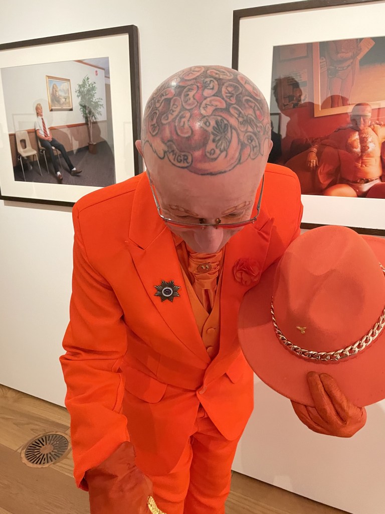 The fun of going to the press preview for this exhibition is the chance to meet the photographers who are there and also some of the subjects. The most striking subject of the morning was Captain Beany taken by Roo Lewis. Barry Kirk, AKA Captain Beany established the world’s only baked bean museum from his council flat in Port Talbot in South Wales. Dressed in very striking orange suit, and with beans tattoo’d on his eyebrows, he cut a spectacular dash next to the photograph taken of him in his Captain Beany outfit, resting at home.