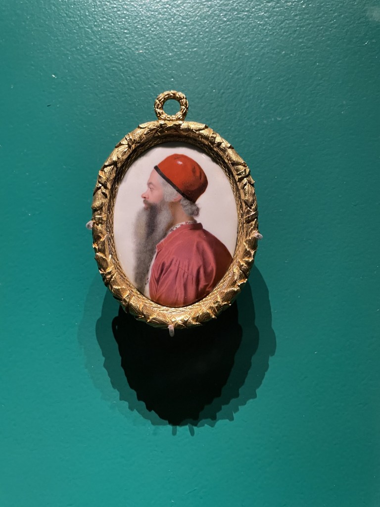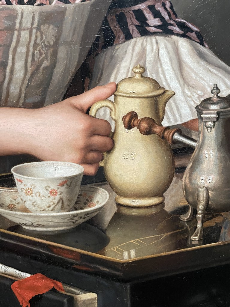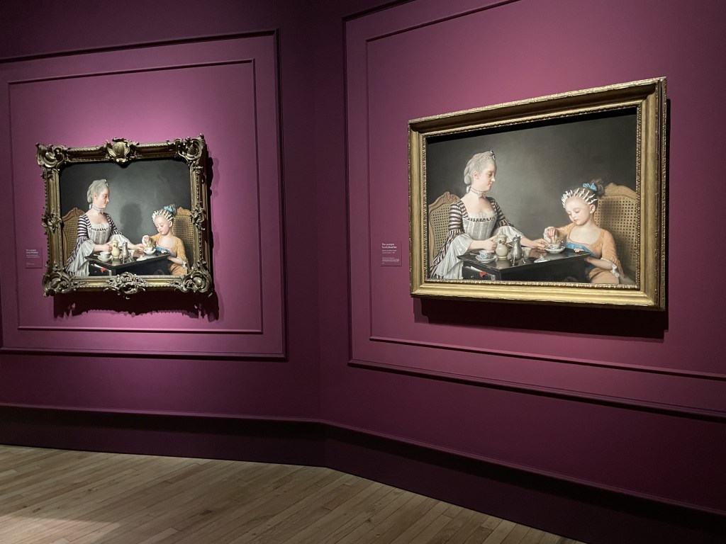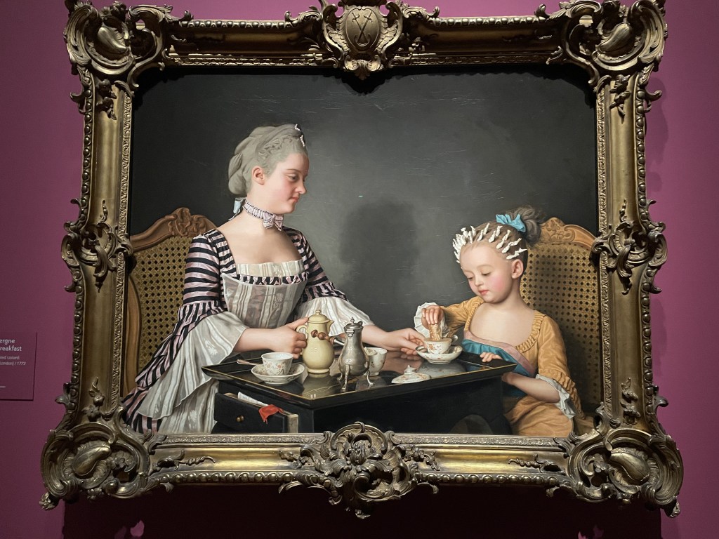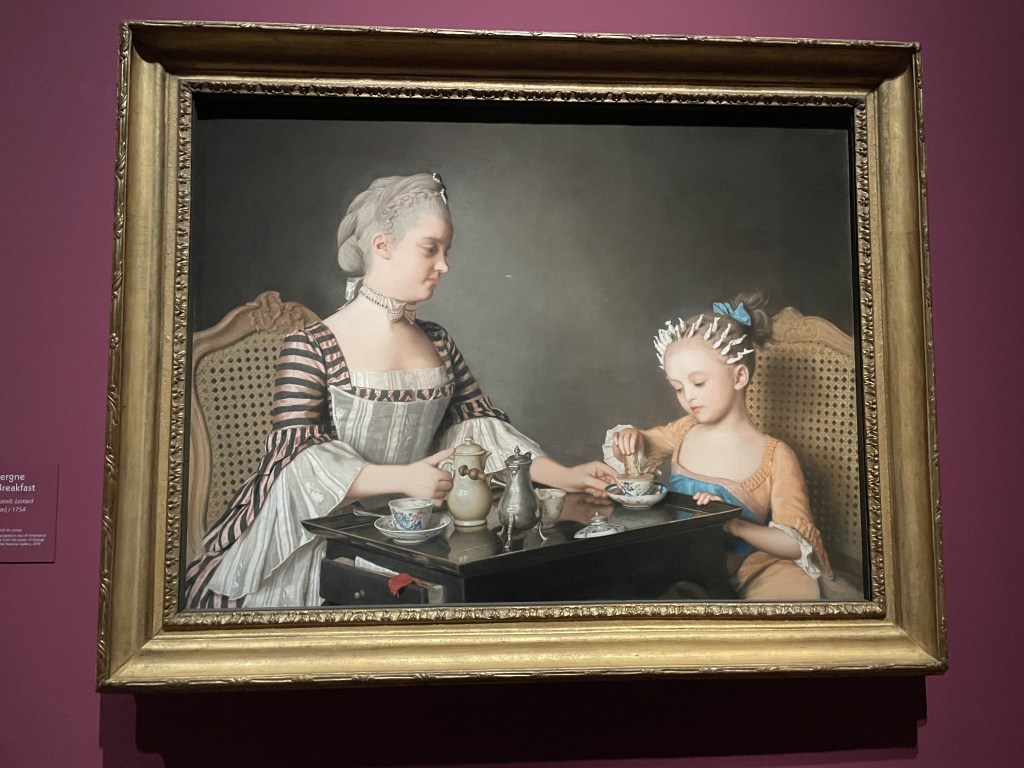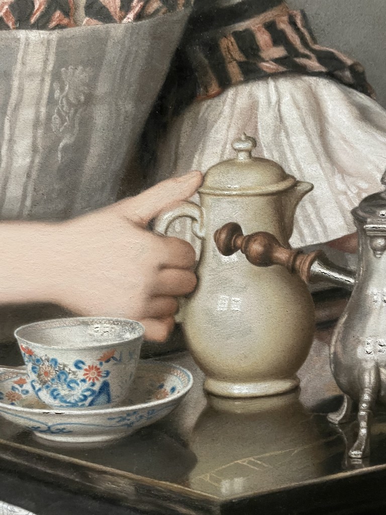 This show is an absolute treat. I was unfamiliar with Liotard before seeing this show. His life filled the span of the 18th century. He was a jobbing artist, a traveller, an engraver and a portraitist. But he became an absolute master of pastels. These were chalk-based dry pastels which he must have sharpened to the most delicate point to use like a fine colour crayon to create the detail. He created the pastel portrait of The Lavergne Family Breakfast in 1754 and sold it to his patron, William Ponsonby, Viscount Duncanon for 200 guineas. He didn’t see the painting for 20 years when he was invited to stay at the Duncanon home. He decided to make a very exact replica in oil paint. It is like seeing double but you can, of course spot the difference.