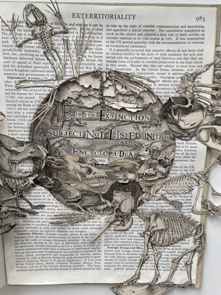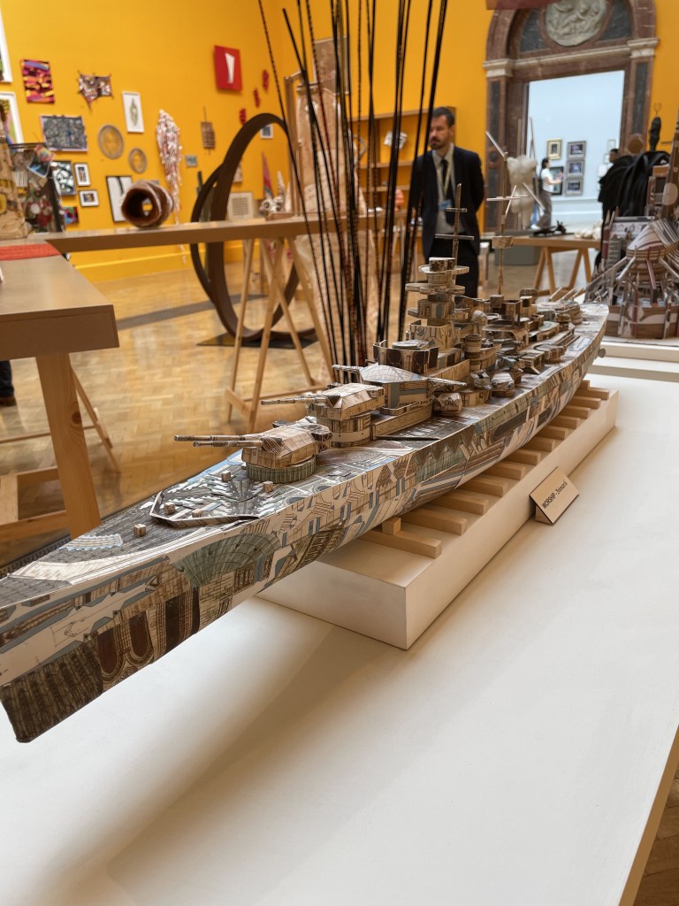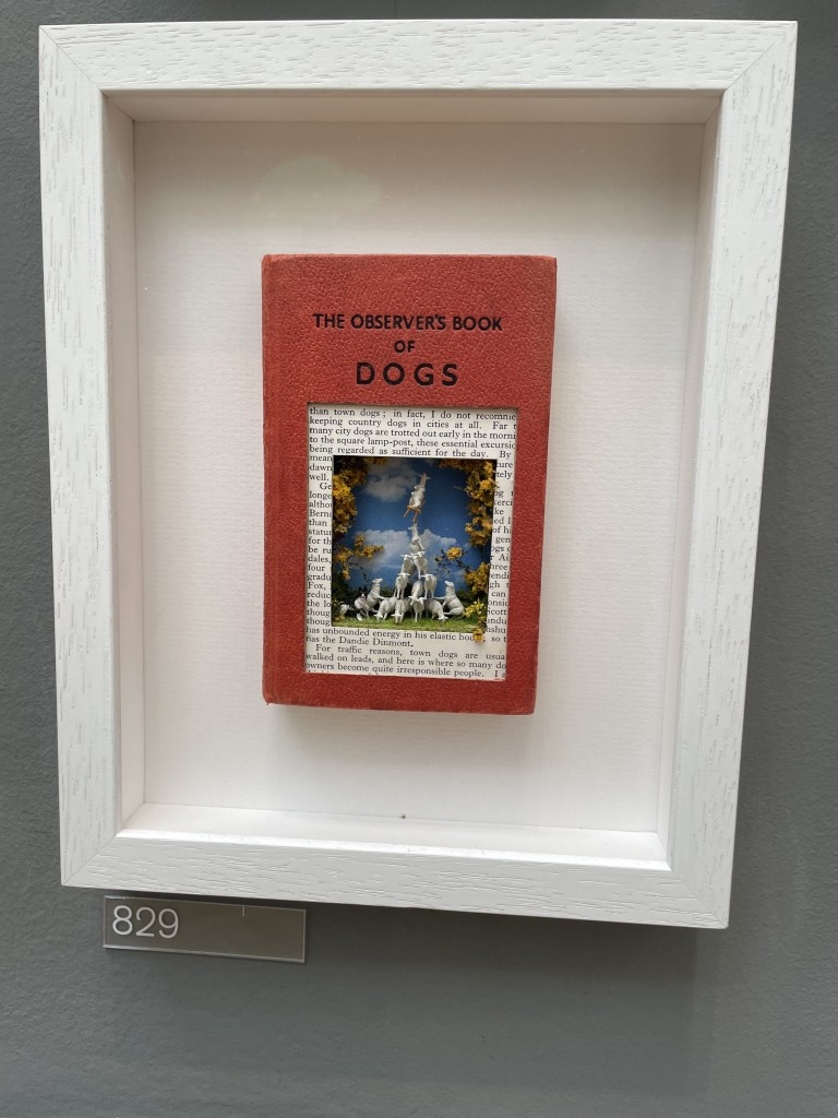 Above are another three paper-based pieces. The ship is a spectacular model created by Richard Wilson RA, The Observer book of dogs, deconstructed by Laura Beaumont and some very delicate vessel, Teacup Murmuration, made from sticky brown paper by Joanna Kori.