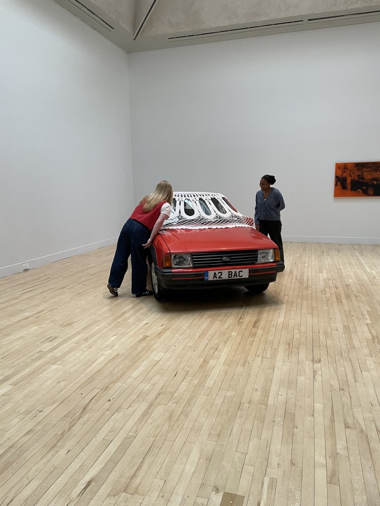 Jasleen Kaur’s rooms are about tradition, memory, family and history. There’s also a very witty quality to the work. A vintage Ford Escort is covered with a large doily crocheted from cotton.