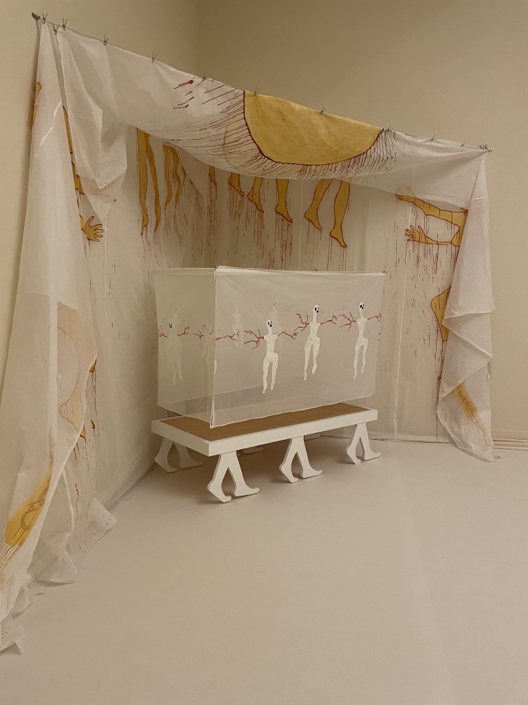 Each of the four artists have created exhibition spaces which have an immersive quality but the Delaine Le Bas room are a riot of black and white exuberance with individual chambers filled with textiles, paint, costume and sculpture. The themes are death, loss and renewal.