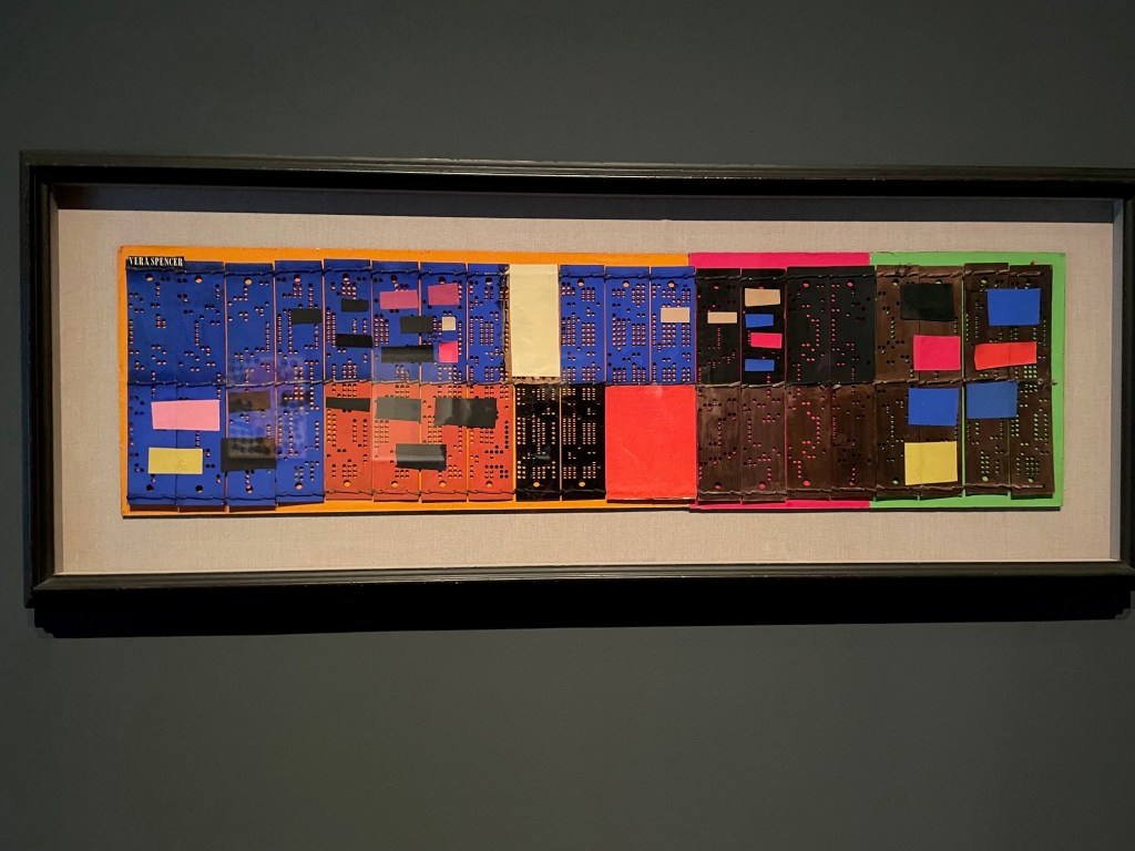 The above image is ‘old school’ in comparison to the screens, flashing and kinetic works which follow but I really liked it. It is made of paper/card, so that helps. It’s by Vera Spencer and entitled Artist versus Machine from 1954. The punched cards are patterns followed by automated looms, early binary storage and the forerunner of computer coding.