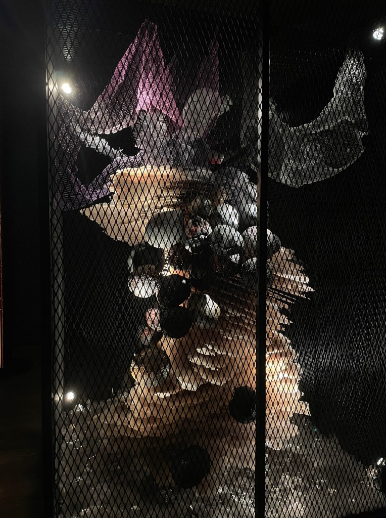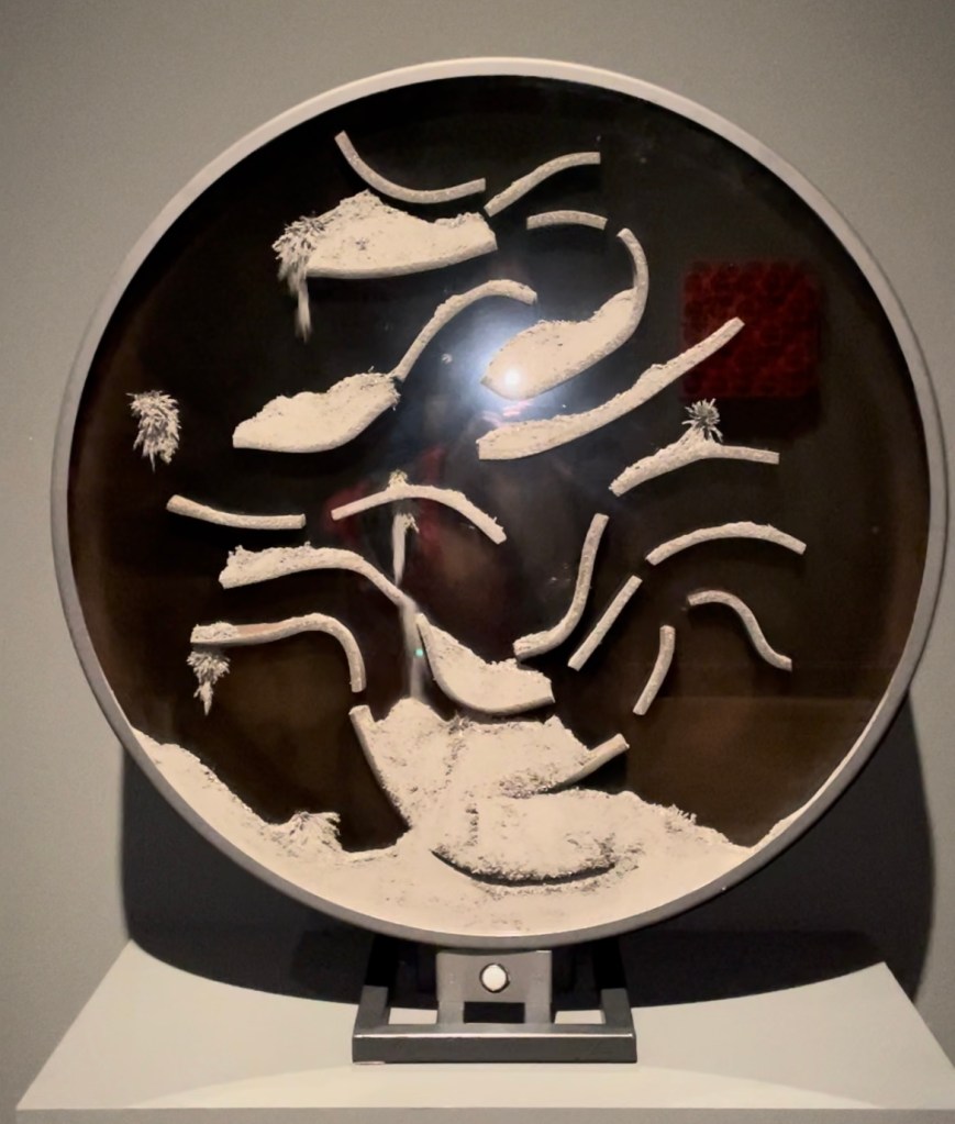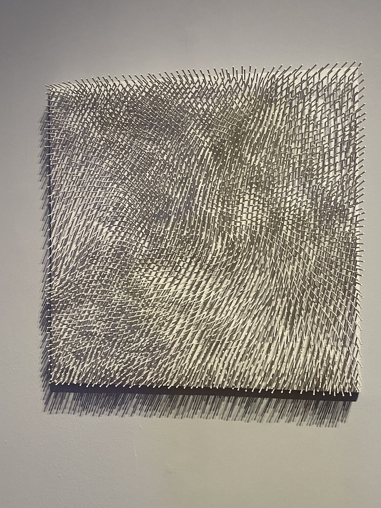 Still clinging to the notion that art is physical, I was drawn to these works which celebrate the use of strange materials, the artist’s capacity for playing with a viewer’s perception and looking at a ‘flat’ artwork and seeing it appear to move. On the left is The Bride by Liliane Ljin using blown glass, ostrich feathers and croched stainless steel. In the middle is White Field by Guner Uecker, painted nails on canvas and on the right is a work from 1964 by Almir Mavignier.