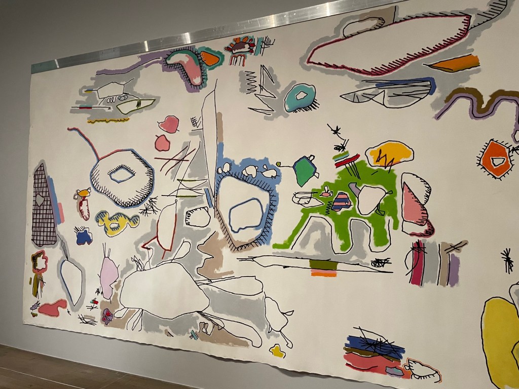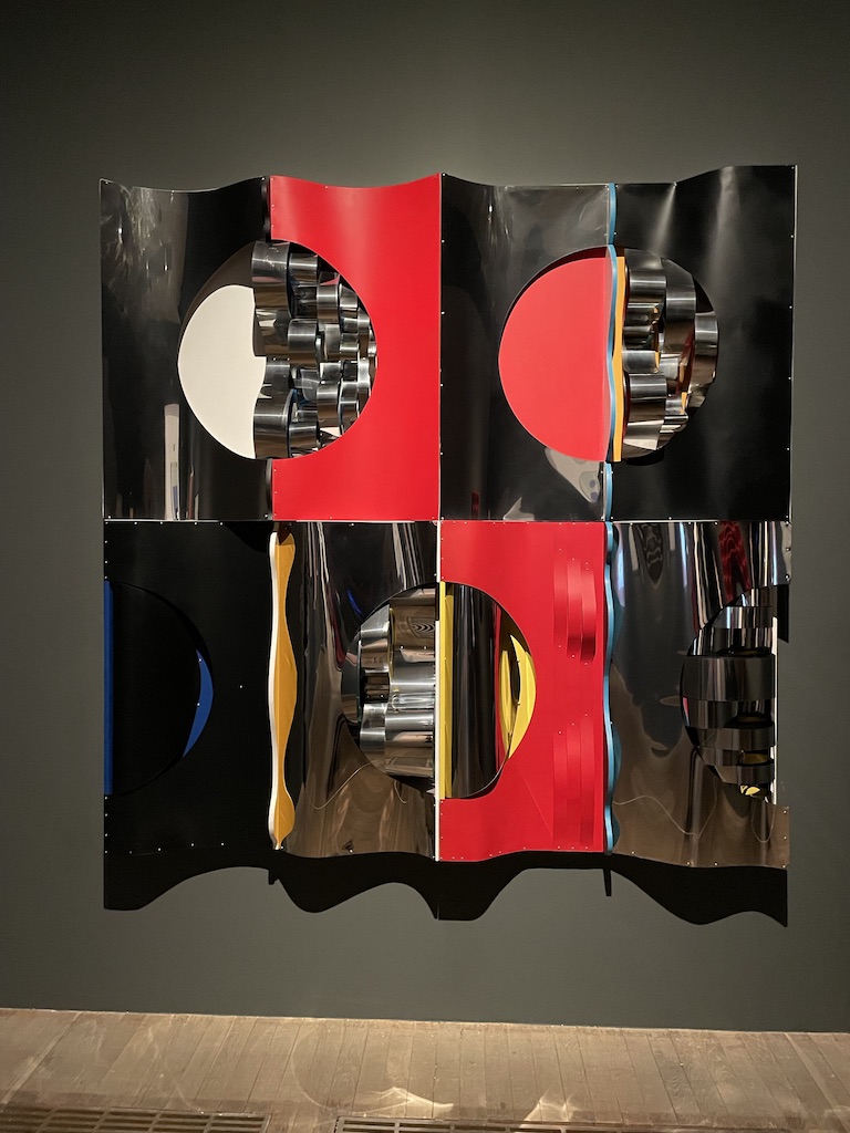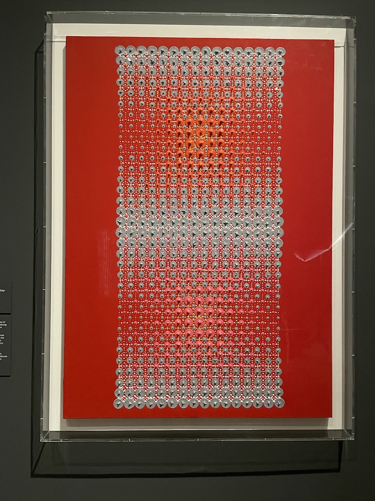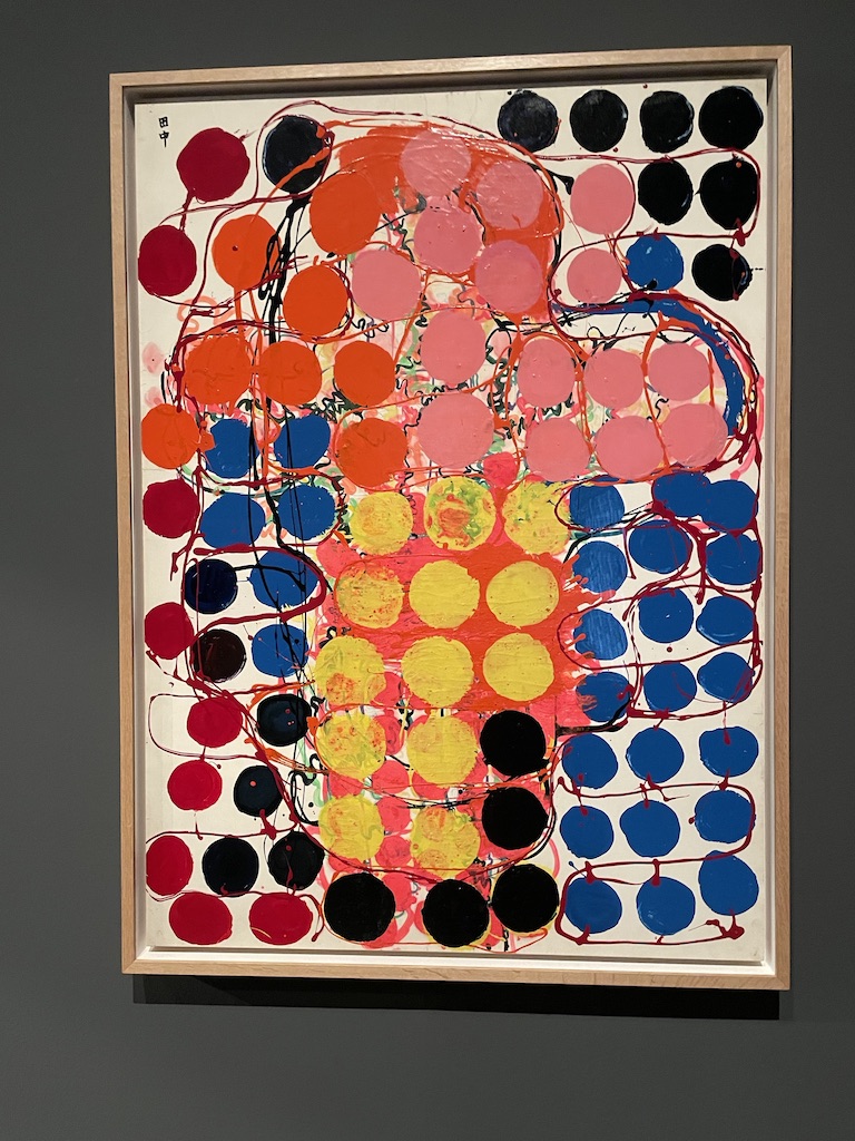 And just a few more examples of the more ‘accessible’ art on surfaces which are mounted on the wall. But you can see how the artists are channelling abstract ideas and using unusual materials to create art. In the centre is a bright work by Atsuko Tanaka from 1957.
