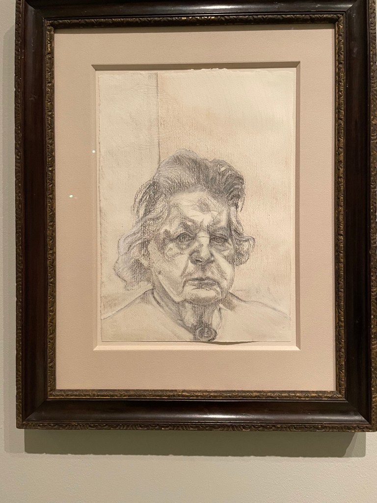 Freud’s mother, Lucie Freud, was also an important model. On the left is a very direct charcoal drawing of her from life and on the right a painting combined with a nude of Jacquetta Eliot.