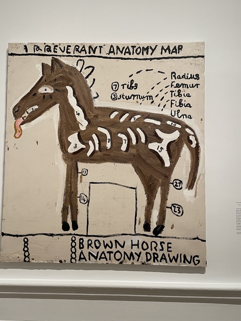 There’s also terrific humour to her work. I did like the daft painting of the horse with an attempt to depict the anatomy of the beast. Her faces, whether human or animal have a charming innocence to them and a lot of eyelashes!