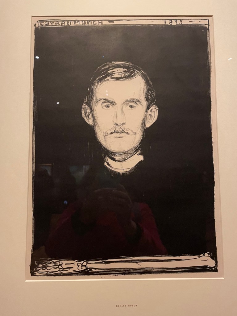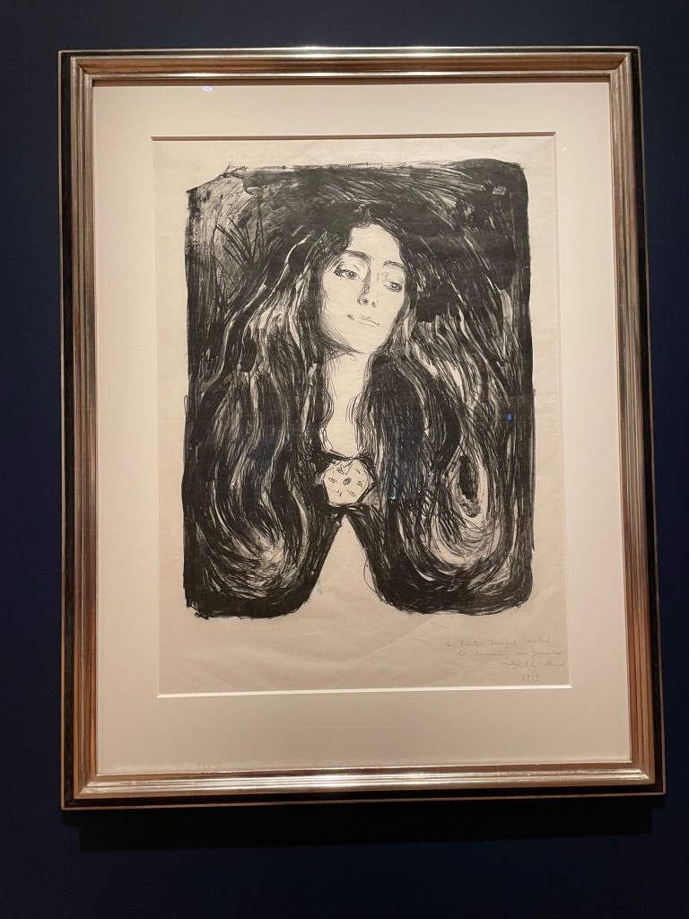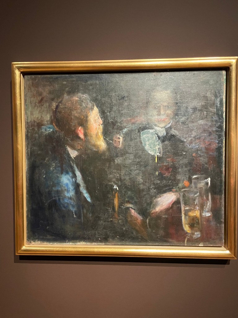 Just a few of the lithographs and black and white portraits (and the very dark one on the right) give a hint of the darkness within. But one comes away from this show in a very uplifted state, pleased to see such great portraiture by one of the 20th century’s finest artists. Above: lithograph portrait of Eva Mudocci, 1902, and self-portrait with skeleton arm, 1895 and on the right Tête à Tête, 1885, showing the painter Karl Jensen-Hjell drinking in the cafe in conversation with woman who might be Inger Munch. Very atmospheric.