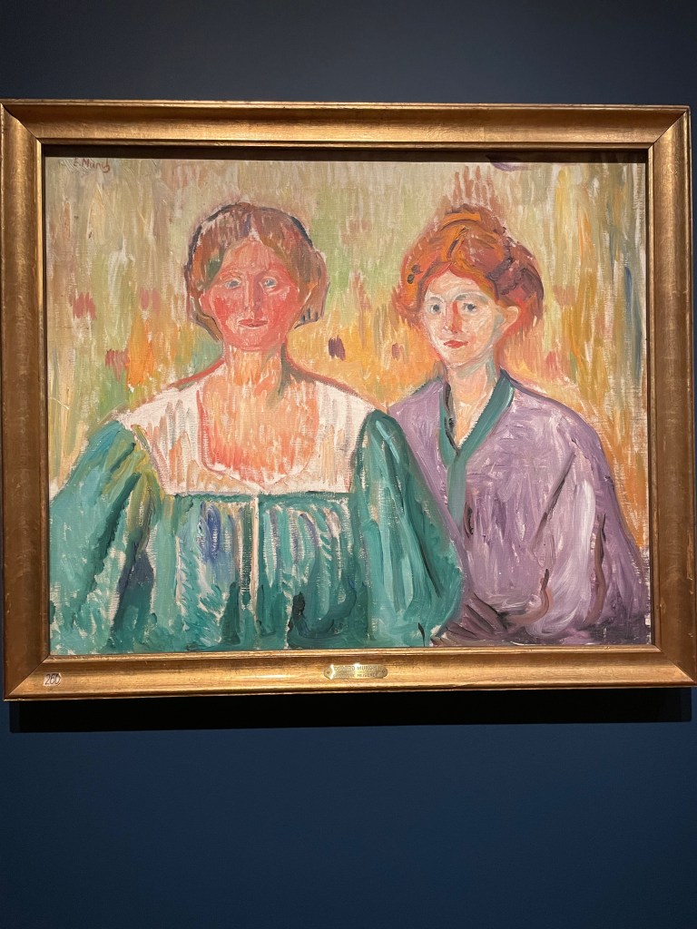 Munch was clearly very fond of his friends and family and painted them with obvious pleasure. And he liked depicting them in pairs. This is very much a theme. People with a connection occupy the same space and, again, were painted at much the same pace with an equal distribution of attention to detail. Above: Lucien Dedichen and Jappe Nilssen – friends from Munch’s student days. And on the right are sisters Olga and Rosa Meissner, professional models.